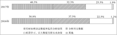 D.与2016年相比,2017年企业实时处理动态数据并提供分析结果所占比例有所增加,并且其所占比例为最高,而以大数据支撑未来决策所占比例为最少。