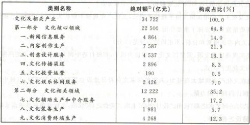 B.2017年全国文化核心领域创造的增加值为22 500亿元,占文化及相关产业增加值的比重为64.8%;文化相关领域创造的增加值为12 222亿元,占比为35.2%,