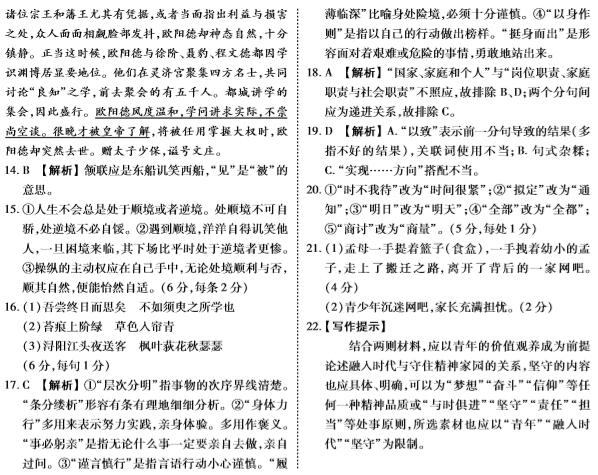 三、语言文字运用(20分) 阅读下面的文字,完成17~19题。 从《孝经》中可以看出,孝道的内涵是有层次性的,而孝道的实践更是 ,针对不同的人,提出不同的规范和标准。如天子之孝是“爱亲者,不敢恶于人;敬亲者,不敢慢于人。爱敬尽于事亲,而德教加于百姓,刑于四海”。天子之孝更重要的是立身为范,以自己 之孝来带动天下百姓的孝道。诸侯之孝则是“在上不骄,高而不危;制节谨度,满而不溢。富贵不离其身,然后能保其社稷,而和其民人”。诸侯之孝在于 、循规守法。这是由诸侯的独特地位所决定的,因为他们位高权重,既贵且富,皇帝很难约束到,其他人又无权约束,如果缺乏自我约束力,就很容易造成因“高”而“危”、因“满”而“溢”的局面,最终导致社稷不保。对普通百姓来说,则要简单得多,只要做到“用天之道,分地之利,谨身节用,以养父母”就行了。因此,职位越高,孝道就越宏大,其价值就越重大,其要求就越严格,就越需要 。( )。个人奋斗的实践路径围绕三大“职责”做基础并统一为一个整体,从而实现从个人心和到群体家和再到天下共和的目标。这是中国传统孝道最为核心的价值所在。 17.依次填入文中横线上的成语,全都恰当的一项是(3分) A.层次分明 事必躬亲 谨言慎行 以身作则 B.条分缕析 身体力行 履薄临深 挺身而出 C.层次分明 身体力行 谨言慎行 以身作则 D.条分缕析 事必躬亲 履薄临深 挺身而出 18.下列在文中括号内补写的语句,最恰当的一项是(3分) A.尤为重要的是,中国的传统孝道不仅将个人、家庭和国家三者统一了起来,还把岗位职责、家庭职责与社会职责三者统一了起来 B.尤为重要的是,中国的传统孝道不仅将国家、家庭和个人三者统一了起来,而且把岗位职责、家庭职责与社会职责三者统一了起来 C.尤为重要的是,中国的传统孝道不是将个人、家庭和国家三者统一了起来,而是把岗位职责、家庭职责与社会职责三者统一了起来 D.尤为重要的是,中国的传统孝道不但将国家、家庭和个人三者统一了起来,也把岗位职责、家庭职责与社会职责三者统一了起来 19.文中画横线的句子有语病,下列修改最恰当的一项是(3分) A.个人奋斗的实践路径以三大“职责”做基础并统一为一个整体,以致实现从个人心和到群体家和再到天下共和的目标。 B.个人奋斗的实践路径围绕以三大“职责”做基础并统一为一个整体的目标,以致实现从个人心和到群体家和再到天下共和。 C.个人奋斗的实践路径以三大“职责”做基础并统一为一个整体的目标,从而实现从个人心和到群体家和再到天下共和的方向。 D.个人奋斗的实践路径以三大“职责”做基础并统一为一个整体,从而实现从个人心和到群体家和再到天下共和的目标。 20.下面是学校广播室广播的一则通知,其中有五处不当的地方,请找出并作修改。(5分) 全市健美操大赛在即,时不我待。现拟定各班参赛同学于明日下午第三节自习课进行第二次赛前排练培训,上次排练全部会跳的几名同学,今天大课间到体育组找郑老师,共同商讨相关训练事宜。 21.仔细观察下面这幅《孟母四迁》的漫画,按要求回答问题。(6分) ![]() (1)简要说明这幅漫画的主要内容。(4分) (2)用一句话说出这幅漫画的寓意。(2分) 四、写作(60分) 22.阅读下面的材料,按照要求写作。(60分) 一个不能投入时代洪流的人是一个落伍者,一个无所坚守的人是一个随波逐流者。前者令人同情,后者令人鄙视。(周国平) 青年的价值取向决定了未来整个社会的价值取向,而青年又处在价值观形成和确立的时期,抓好这一时期的价值观养成十分重要。(习近平总书记) 以上材料触发了你怎样的思考?请写一篇文章,谈谈你的看法。 要求:选好角度,确定立意,明确文体,自拟标题;不要套作,不得抄袭;不少于800字。 ![]()