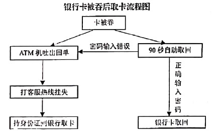 下面是银行卡被吞后取卡流程图,请把这个流程图写成一段话,要求内容完整,表述准确,不超过80个字。