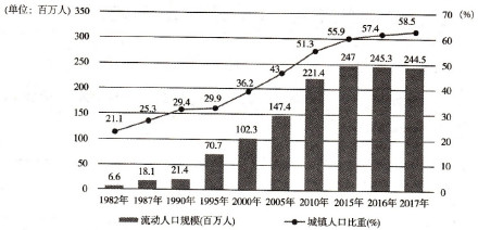 B.材料二运用图表直观地呈现了1982年以来我国流动人口的规模,以及城镇人口的比重,隐约地表达了对流动人口减少而导致城市劳动力不足的担忧。