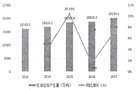 图表2:2014-2017年全国大、中城市生活垃圾产生量变化情况