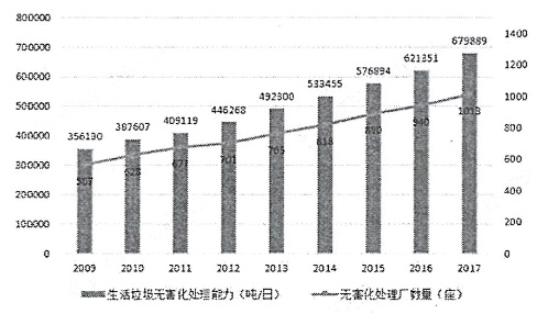 图表1:2009-2017年中国生活垃圾无害化处理能力及处理场数量变化情况
