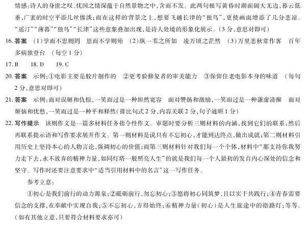 四、写作(60分) 22.阅读下面的材料,根据要求写作。(60分) 材料一:《诗经》有言:“靡不有初,鲜克有终。” 材料二:屈原的初心是“虽九死其犹未悔”;范仲淹的初心是“先天下之忧而忧,后天下之乐而乐”;岳飞的初心是“待从头,收拾旧山河”;苏轼则说“守其初心,始终不变”。 材料三:现如今许多中国人秉持着“为人民谋幸福,为民族谋复兴”的遵旨,奋战在新时代的最前线。而我们每一个普通的个体,在人生路上,都会遇到挫折和苦难,那支持你我努力走下去,永不放弃的精神力量,如同灯塔一般照亮人生。 读了上述材料,你有怎样的思考?请写一篇文章,适当引用材料中的名言。要求:自拟标题,自选角度,确定立意;不要套作,不得抄袭;不得泄露个人信息;不少于800字。 ![]() ![]()