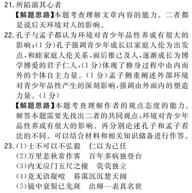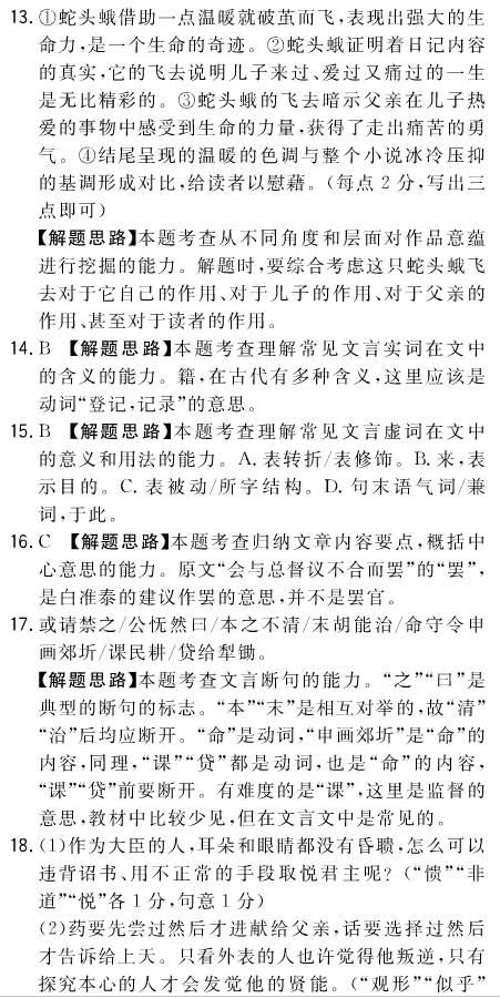 三、古代诗文阅读(共40分) (一)阅读下面的文言文,完成14~18题。(20分) 山东巡抚白公墓志铭 [清]袁枚 皇上御极之十有七年,奸民构逆语假吏部尚书孙嘉淦谏章,流传山东。巡抚准公获一纸,交臬司某穷竟其事,务得主名再奏。适滇省以闻,臬司惧,越奏之。上疑公欺,致公于理。公之狱词曰“未得伪造者姓名,遽妄奏,臣不敢也。且缓之,则易于钩考,罪人斯得;暴章之,则彼或闻风窜伏,而平民转罹于辜,故隐忍不发。此臣罪也。拟大辟固当。”上怜其愚,赦之,发香山监工,以老病卒。 公由笔帖式内府主事,受知世宗,累官福建将军。乾隆元年,改官巡道,公以疾辞。上怒,籍其家。无长物,得簿:自出使迄入都,公私出入,纤毫如列眉。上以为廉,授长芦盐院,调两淮。公辜较引课①,辨其赢缩,不忸忲②小利,不责奇羡,分刌节度,有不便辄弛以利民。九年,巡抚安徽。 先是,庐、凤地硗狭,多遨民,饥即避宅盘游,矠鱼擉鳖③,挈其孥,捶小朄④,野歌匄⑤钱。或请禁之公怃然曰本之不清末胡能治命守令申画郊圻课民耕贷给犁锄。外延染人机工,教蹑丝法。畜蚕,树桃、麻、桑、柘,朝夕程督。未期年,民恋其业,驱之不行。今凤、颍、滁、亳所织绢带丝布,转鬻苏、杭数州。加兵部侍郎,抚广东,调山西,再调山东。十六年,上南巡,自德州至红花埠凡十三营,公修扦督治惟敬。或劝拘虎豹,备弹弦踮躧⑥为供奉者,公大惊曰:“皇上为观河省稼巡狩,玺书如日。为大臣者,耳目未愦,其可违诏以非道悦耶?”除方物外,无所贡。泰山、林外,不置供顿,清跸除道而已。 公貌不逾中人,而举止严重,暗室坐未尝跛倚。眴人目微斜。遇大事,虚已集议。既定,屹不可动。抚广时,西洋人某诱澳门民夷言,服其国服,连惠、潮诸州。公怒,毁天主堂,惩治之,洋人大创。安南国王为其臣郑杠所弑,国乱,群姓角争,互乞天朝兵为援。公欲奏以一旅师深入诛篡弑者,为设郡置吏,仍归汉、唐版图。会与总督议不合而罢。论者惜之。 公姓白,名准泰,字健斋,号雪村,正黄旗人。赐姓他喇氏。先世为高丽人。子某。葬某。 铭曰:药先尝而后进之父,言先择而后告于天。观形者似乎逆,而原心者觉其贤。以是归田,以是获全,又何瞢焉?而况乎七十有二之高年! [注]①辜较引课:查对税收。②忸忲(niǔ shì):遵从既定的规定行事。③矠(zé)鱼擉(chuò)鳖:用叉矛刺取鱼和鳖。④朄(yǐn):古代敲击用以引乐的小鼓。⑤匄(gài):同“丐”,乞讨。⑥踮躧(diǎn xǐ):拖着鞋子,脚尖轻轻着地而行。指跳舞。 14.对下列句子中加点词语的解释,不正确的一项是(3分) A.交臬司某穷竟其事 竟:追究 B.上怒,籍其家 籍:登记册 C.除方物外,无所贡 方物:本地特产 D.眴人目微斜 眴(shùn):使眼色 15.下列各组句子中,加点词的意义和用法相同的一组是(3分) A.而平民转罹于辜 弃甲曳兵而走 B.有不便辄弛以利民 作师说以贻之 C.安南国王为其臣郑杠所弑 公之逮所由使也 D.以是获全,又何瞢焉 有鱼焉,其广数千里 16.下列对原文有关内容的概括与赏析,不正确的一项是(3分) A.文章先写白准泰在山东巡抚任上被无辜下狱,最后老病而死的不幸事迹,为这位办事周全、体恤百姓的官员的一生,首先渲染了一层悲壮色彩。 B.白准泰巡抚安徽时,劝民耕桑,使地方经济状况有所好转,社会风气发生变化。巡抚,又称抚台,是清代主管一省军政、民政的封疆大吏。 C.当安南国发生叛乱,向清廷求救之际,白准泰建议马上出兵平乱,此举却受到广州总督的阻挠,以致白准泰为此愤而罢官,令人唏嘘。 D.本文骈散结合,记叙和议论相得益彰:以散文形式叙写白准泰的生平,突出他的政绩;以韵文形式赞扬白准泰品德高尚、得享高寿。 17.用“/”给文中画波浪线的部分断句。(3分) 或请禁之公怃然曰本之不清末胡能治命守令申画郊圻课民耕贷给犁锄 18.把文中画横线的句子翻译成现代汉语。(8分) (1)为大臣者,耳目未愦,其可违诏以非道悦耶?(4分) (2)药先尝而后进之父,言先择而后告于天。观形者似乎逆,而原心者觉其贤。(4分) (二)阅读下面这首诗,完成19,20题。(8分) 羸骏 白居易 骅骝失其主,羸饿无人牧。 向风嘶一声,莽苍黄河曲。 蹋冰水畔立,卧雪冢间宿。 岁暮田野空,寒草不满腹。 岂无市骏者,尽是凡人目。 相马失于瘦,遂遗千里足。 村中何扰扰,有吏征刍粟。 输彼军厩中,化作驽骀①肉。 [注]①驽骀;指劣马。 19.本诗以骏马被弃之后的不幸遭遇,暗含着对 的同情和对 的呼吁。(2分) 20.本诗在叙述上颇有特色,试赏析。(6分) (三)阅读下面的材料,完成21,22题。(6分) 陈成子弑简公,孔子沐浴而朝,告于哀公曰:“陈恒弑其君,请讨之!”公曰:“告夫三子。”孔子曰:“以吾从大夫之后,不敢不告也。君曰:‘告夫三子者。’”,之三子告,不可。孔子曰:“以吾从大夫之后,不敢不告也。” (《论语·宪问》) 卫灵公问陈于孔子。孔子对曰:“俎豆之事,则尝闻之矣;军旅之事,未之学也。”明日遂行①。 (《论语·卫灵公》) [注]①明日遂行:卫灵公无道,有志于战伐之事,故孔子去之。 21.孔子两次言及“以吾从大夫之后,不敢不告也”,表现其 的精神和 的心情。(2分) 22.根据上述材料,简析孔子对于军事的看法。(4分) (四)古诗文默写。(6分) 23.补写出下列名句名篇的空缺部分。(只选3小题)(6分) (1)子曰:“克己复礼为仁。一日克己复礼, 。 ,而由人乎哉?” (《论语》) (2)吾闻之,新沐者必弹冠, 。安能以身之察察, ? (《渔父》) (3) ,直走咸阳。 ,