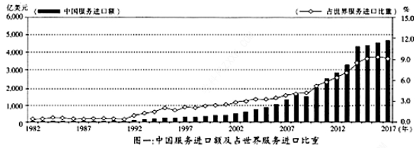 B. 由图一可知,八十年代初期,中国服务贸易处于起步阶段。从2008年起,中国服务进口额上升到2000亿美元以上,之后逐年增加。