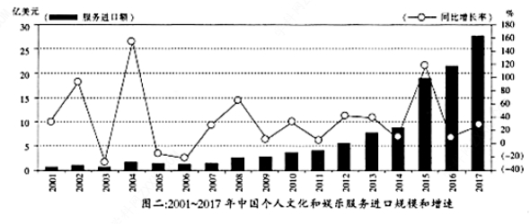 C. 由图二可知,中国个人文化和娱乐服务进口额从2012年到2017年由5亿多美元上升到25亿美元以上,同比增长率在2015年为100%,仅低于2004年。