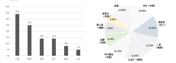 各国5G标准必要专利申请分布 各企业5G必要专利申请比例
