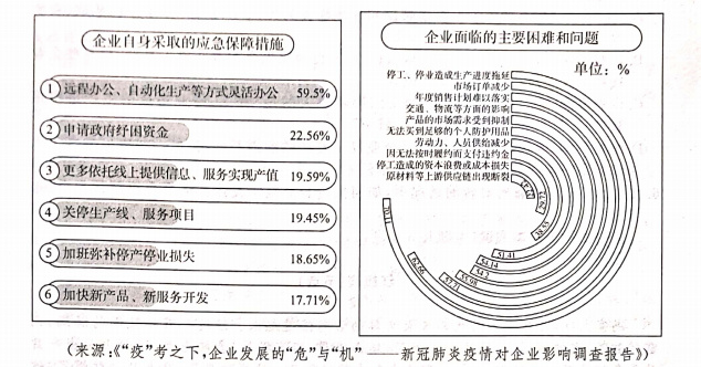 B.材料二显示.59.5%的企业采取远程办公、A动化生产等方式复工复产,也有些企业选择了开发新产品、改变服务模式。