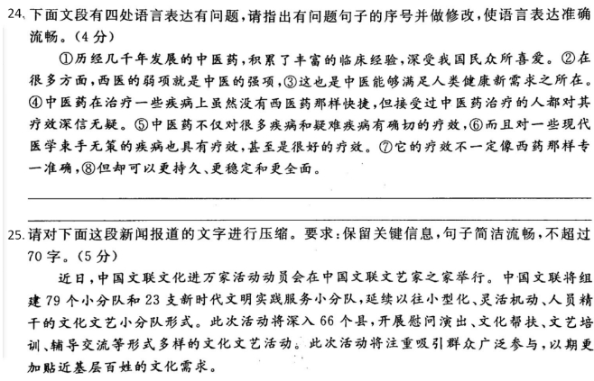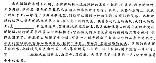 三、本大题共 4 小题,共 24分。 (一)阅读下面这首宋诗,完成12、13题。 寄田锡①舍人 张咏 当年心计此心知,忽忽逢人亦自疑。 枉是忧公生白发,有何长略谢清时。 林僧已怪抽身晚,朝侣犹嫌到阙迟。 多喜通规识幽抱,路遥无处寄相思。 (注)①田锡:北宋初年政治家、作家。田锡、张咏在政治上都以敢言直谏著称。 14.阅读下面这首词,从全词内容的角度,为下面这首词拟题(“无题”除外),并请简述理由。(5分) 渔家傲·________ 【北宋】强至 雪月照梅溪畔路,幽姿背立无言语。冷浸瘦枝清浅处,香暗度,妆成处士横斜句。 浑似玉人常淡伫,菱花相对成清楚。谁解小图先画取,天欲曙,恐随月色云间去. 15、(6分)在横线处填写作品原句。 (1)白居易《琵琶行》运用了以声音写声音的手法来写琵琶声:“________,_______。间关莺语花底滑,幽咽泉流冰下难。” (2)古代文人常常喜欢“啸咏”,除了六一居士啸咏于琅琊山水,陶渊明也曾写道:“____________,___________。聊乘化以归尽,乐夫天命复奚疑!”(《归去来兮辞》) (3)“醉翁啸咏,声和流泉”一句呼应了《醉翁亭记》中“醉翁之意不在酒,在乎山水之间也”“_______________,___________________”等寄情山水的名句。 四、本大题共 6 小题,共 20 分。 阅读下面作品,完成1—5题。 草原八月末 ①朋友们总说,草原上最好的季节是七八月,一望无际的碧草如毡如毯,上面盛开着数不清的五彩缤纷的花,如繁星在天,如落英在水,风过时草浪轻翻,花光闪烁,那景色是何等地迷人。但是不巧,我总赶不上这个季节,今年上草原时,又是八月之末了。在城里办完事,主人说:“怕这时坝上已经转冷,没有多少看头了。”我想总不能枉来一次,还是驱车上了草原。 ②从围场县出发,翻过山,穿过茫茫林海,过一界河,刚才在山下沟谷中所感受的峰回路转和在林海里感觉到的绿浪滔天,一下都被甩到另一个世界上,天地顿时开阔得好像连自己的五脏六腑也不复存在。 ③草色已经转黄了,在阳光下泛着金光。由于地形的变换和车子的移动,那金色的光带在草面上掠来飘去,像水面闪闪的亮波,又像一匹大绸缎上的反光。看着这些,你突然会感到自己身体的四壁已豁然散开,所有的烦恼连同所有的雄心、理想都一下逸散得无影无踪。你已经被融化在这透明的天地间。 ④车子在缓缓地滑行,除了车轮与草的摩擦声,便什么也听不到了。草一丝不动,因此你也无法联想到风的运动。放眼尽量地望,细细地寻,不见一个人,于是那牛羊群也不像是人世之物了。我努力想用眼睛找出一点声音。牛羊在缓缓地移动,它不时抬起头看我们几眼,或甩一下尾,像是无声电影里的物。仿佛连空气也没有了,周围的世界竟是这样空明。 ⑤这偌大的草原又难得的干净。干净得连杂色都没有。这草本是一色的翠绿,说黄就一色的黄,像是冥冥中有谁在统一发号施令。树是成片的林子,却整齐得像一块刚切割过的蛋糕,摆成或方或长的几何图形。一色桦木,雪白的树干,上面覆着黛绿的树冠。远望一片林子就如黄呢毯上的几块积木,偶有几株单生的树,插在那里,像白袜绿裙的少女,亭亭玉立。蓝天之下干净得就剩下了黄绿、雪白、黛绿这三种层次。 ⑥在这个大浅盘的最低处是一片水,当地叫泡子,其实就是一个小湖。当年康熙帝的舅父曾带兵在此与阴谋勾结沙俄叛国的噶尔丹部决一死战,并为国捐躯。因此这地名就叫将军泡子。水极清,也像凝固了一样,连倒影的云朵也纹丝不动。对岸有石山,鲜红色,说是将士的血凝成。历史的活剧已成隔世渺茫的传说。我遥望对岸的红山,水中的白云,觉得这泡子是一块凝入了历史影子的透明琥珀,或一块凝有三叶虫的化石。往昔岁月的深沉和眼前大自然的纯真使我陶醉。历史只有在静思默想中才能感悟,有谁会在车水马龙的街市发思古之幽情?这空旷、静谧、水草连天、蓝天无垠的草原,教人真想长啸一声念天地之悠悠,想大呼一声魂兮归来。教人灵犀一点想到光阴的飞逝,想到天地人间的久长。 ⑦我们将返回时,主人还在惋惜未能见到草原上千姿百态的花。我说,看花易,看这草原的纯真难。感谢上帝的安排,阴差阳错,我们在花已尽、雪未落、草原这位小姐换装的一刹那见到了她不遮不掩的真美。正如观众在剧场里欣赏舞台上浓妆长袖的美人是一种美,画家在画室里欣赏裸立于窗前晨曦中的模特又是一种美。两种都是艺术美,但后者是一种更纯更深的展示着灵性的美。这种美不可多得也无法搬上舞台,它不但要有上帝特造的极少数的标准的模特,还要有特定的环境和时刻,更重要的还要有能生美感共鸣的欣赏者。这几者一刹那的交汇,才可能迸发出如电光石火般震颤人心的美。 ⑧大凡看景只看人为的热闹,是初级;抛开人的热闹看自然之景,是中级;又能抛开浮在自然景上的迷眼繁花而看出个味和理来,如读小说分开故事读里面的美学、哲学,这才是高级。这时自然美的韵律便与你的心律共振,你就可与自然对话交流了。 ⑨呜呼!草原八月末。大矣!净矣!静矣!真矣!山水原来也和人一样会一见钟情,如诗一样耐人寻味。我一步三回头地离开那块神秘的草地。将要翻过山口时又停下来伫立良久。明年这时还能再来吗?我的草原。 (取材于梁衡同题散文) 16.下列词语中的加点字解释,不正确的一项是(3分) A.落英:花 B.亭亭玉立:高耸直立的样子 C.蓝天无垠:边界 D.一见钟情:衷心 17.下列