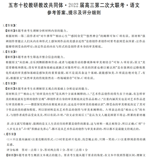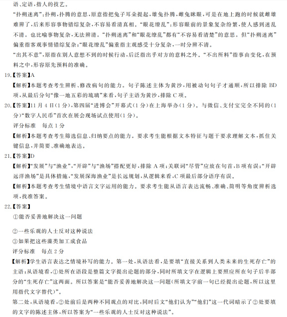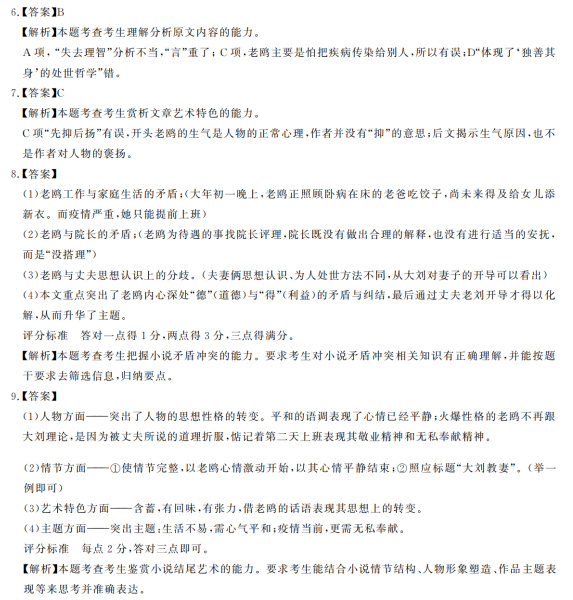 二、古代诗文阅读(35分) (一)文言文阅读(本题共5小题,20分) 阅读下面的文言文,完成10~14题。 魏文帝黄初四年春三月,汉主病笃,命丞相亮辅太子,以尚书令李严为副。汉主谓亮曰:“君才十倍曹丕,必能安国,终定大事。若嗣子可辅,辅之;如其不才,君可自取。”亮涕泣曰:“臣敢不竭股肱之力,效忠贞之节,继之以死。”汉主又为诏敕太子曰:“人五十不称夭,吾年已六十有余,何所复恨,但以卿兄弟为念耳。勉之,勉之!勿以恶小而为之,勿以善小而不为。惟贤惟德,可以服人。汝父德薄,不足效也。汝与丞相从事,事之如父。” 夏四月癸巳,汉主殂于永安,谥曰昭烈。五月,太子禅即位,大赦,改元建兴。封丞相亮为武乡侯,领益州牧。政事无巨细,咸决于亮。 初,益州郡耆帅雍闿杀太守正昂,因士燮以求附于吴,又执太守成都张裔以与吴,吴以闿为永昌太守。永昌功曹吕凯、府丞王伉率吏士闭境拒守,闿不能进,使郡人孟获诱扇诸夷,诸夷皆从之。牂柯太守朱褒、越巂夷王高定皆叛应阅。诸葛亮以新遭大丧,皆抚而不讨,务农殖谷,闭关息民,民安食足,而后用之。 六年秋七月,汉诸葛亮至南中,所在战捷。亮由越巂入,斩雍阅及高定。使庲降督益州李恢由益州入,门下督巴西马忠由牂柯入,击破诸县,复与亮合。孟获收闿余众以拒亮。获素为夷、汉所服,亮募生致之,既得,使观蜀军,且问曰:“此军何如?”获曰向者不知虚实故败今蒙赐观营陈若只如此即定易胜耳亮笑纵使更战七纵七禽而亮犹遣获获止不去曰:“公,天威也,南人不复反矣。”亮遂至滇池。益州、永昌、牂柯、越巂四郡皆平,亮即其渠率而用之,悉收其俊杰孟获等以为官属,出其金银、丹漆、耕牛、战马以给军国之用。自是,终亮之世,夷不复反。 (《通鉴纪事本末·诸葛亮出师》,有删改) 相关链接:成都武侯祠内有一副清代赵藩撰书的对联名扬遐迩,人称“攻心联”。联文是:“能攻心则反侧自消,从古知兵非好战;不审势即宽严皆误,后来治蜀要深思。” 10.下列对文中画波浪线部分的断句,正确的一项是(3分) A.获曰/向者不知虚实故败/今蒙赐观营/陈若只如此/即定易胜耳/亮笑/纵使更战七纵七禽/而亮犹遣获/获止不去/ B.获曰/向者不知虚实/故败/今蒙赐观营/陈若只如此/即定易胜耳/亮笑纵使/更战七纵七禽/而亮犹遣获/获止不去/ C.获曰/向者不知虚实/故败/今蒙赐观营陈/若只如此/即定易胜耳/亮笑/纵使更战/七纵七禽/而亮犹遣获/获止不去/ D.获曰/向者不知虚实故败/今蒙赐观营陈/若只如此/即定易胜耳/亮笑纵使/更战七纵七禽/而亮犹遣获/获止不去/ 11.下列对文中加点词语的相关内容的解说,不正确的一项是(3分) A.嗣子,指帝王或诸侯的承嗣子(多为嫡长子),后也泛指嫡长子。在文中是指蜀汉政权继承人刘禅。 B.大赦,是赦令的一种,对若干已判罪犯赦免或者减刑;但犯“十恶”之罪的人通常不在赦免之列。 C.夷,我国古代对东部各民族的统称,后来蔑指中原以外的各族。文中“夷”是指中国西南的少数民族。 D.渠率,同“渠帅”,旧时统治阶级称武装反抗者的首领或部落酋长,也泛指魁首。文中指雍闿等叛乱者。 12.下列对原文有关内容的概述,不正确的一项是(3分) A.汉主刘备病重,一方面诏令诸葛亮辅佐太子,另一方面诏令太子要与丞相一起谋大事,对待丞相要像对待父亲一样。 B.黄初四年四月癸巳,汉王病逝,谥号为昭烈皇帝。五月,太子刘禅即位,大赦天下。政事无论大小,都由诸葛亮决定。 C.诸葛亮到达南中,所到之处捷报频传。他让李恢与马忠从益州、群柯两路进军讨伐,击破各县叛军之后,与自己会合。 D.诸葛亮生擒孟获后,在当地很有威望的孟获竟不愿意离开,因为他觉得诸葛亮是具有天威之人,他保证不会再造反。 13.把文中画横线的句子翻译成现代汉语。(8分) (1)臣敢不竭股肱之力,效忠贞之节,继之以死。(4分) (2)因士燮以求附于吴,又执太守成都张裔以与吴。(4分) 14.“攻心联”中的“攻心”与“审势”表现了诸葛亮的非凡智慧,这种智慧在本文中分别体现在什么事情上?请简要概括。(3分) (二)古代诗歌阅读(本题共2小题,9分) 阅读下面这首宋诗,完成15~16题。 登快阁 黄庭坚 痴儿了却公家事,快阁东西倚晚晴。 落木千山天远大,澄江一道月分明。 朱弦已为佳人绝,青眼聊因美酒横。 万里归船弄长笛,此心吾与白鸥盟。 [注]《吕氏春秋·本味篇》载:“钟子期死,伯牙破琴绝弦,终身不复鼓琴,以为世无足复为鼓琴者。”史载阮籍善为青白眼,“见礼俗之士,以白眼对之”“见所悦之人,乃见青眼”。 15.下列对这首诗的赏析,不正确的一项是(3分) A.首联自称“痴儿”,颇具谐趣,“了却公家事”含义丰富,有不愿粘滞于公事上的自醒,也有了却公事而登快阁的自快。 B.颔联“落木”意象,与杜甫诗“无边落木萧萧下”中的“落木”相比,有着一样的雄浑壮阔,但少了悲凉,多了洒脱。 C.颈联运用两个典故,表现出诗人因知音不在,早已没有弄弦吹箫的兴致了,只有见到清樽美酒,眼中才流露出喜色。 D.尾联意蕴深远,其中“笛”这一意象与刘禹锡的“怀旧空吟闻笛赋,到乡翻似烂柯人”中的“笛”所蕴含的情感相同。 16.翁方纲评黄庭坚诗云:“东坡之外又出此一种绝高之风骨,绝大之境界。”细吟此诗,当之无愧。全诗是怎样表现“绝高之风骨,绝大之境界”的,请加以分析。(6分) (三)名篇名句默写(本题共1小题,6分) 17.补写出下列句子中的空缺部分。