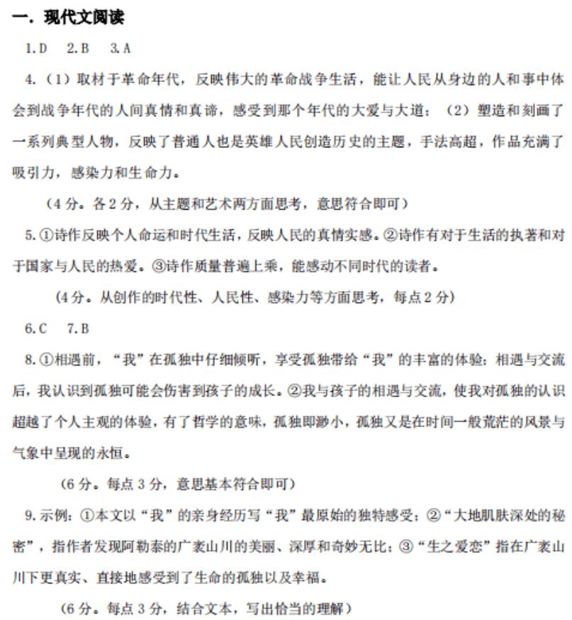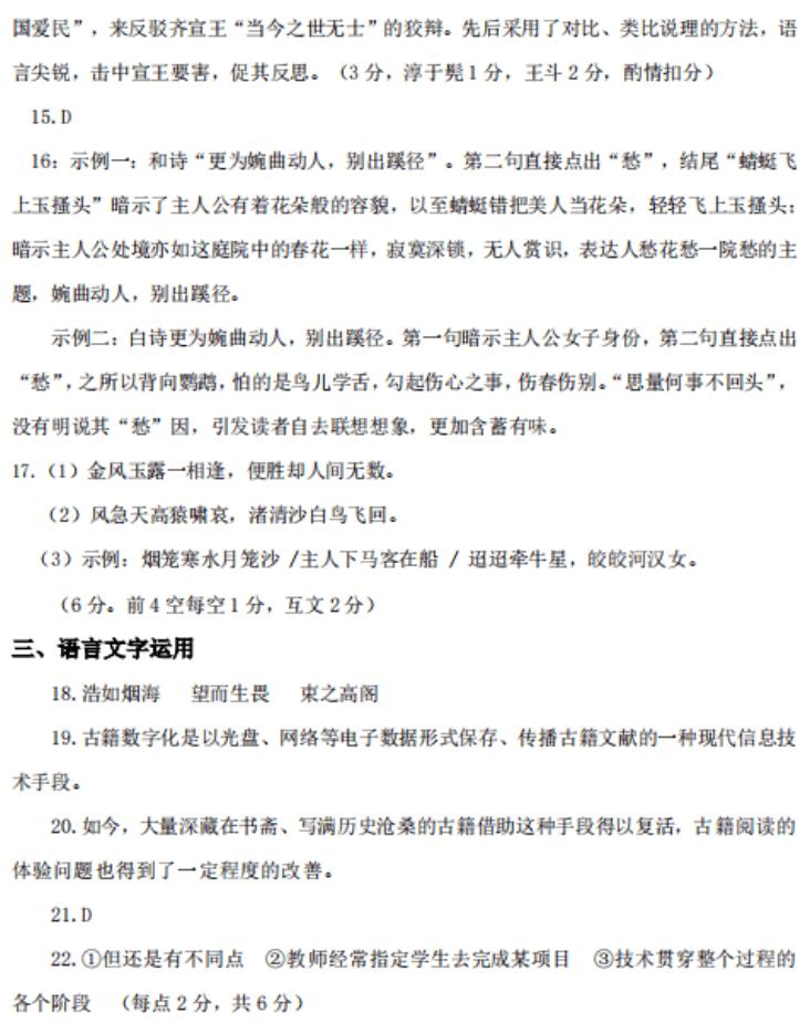 四、写作(60分) 23.阅读下面的材料,根据要求写作。(60分) 1936年9月,浙江大学校长竺可桢在新生开学典礼上讲演:“诸位在校,有两个问题应该自己问问,第一,到浙大来做什么?第二,将来毕业后要做什么样的人?” 2005年7月,93岁高龄的上海大学首任校长钱伟长最后一次参加学校的毕业典礼,对同学们说:“我今天送你们一句座右铭,叫先天下之忧而忧,后天下之乐而乐。应该是为人民的“忧”而“忧”,为人民的“乐”而“乐”。我今天提醒你们,不是让你们不好意思,而是深深想一下,我们的人生前途应该服从这条路。” 两位校长的话具有启示意义。请结合材料写一篇文章,体现你的感悟与思考。 要求:选准角度,确定立意,明确文体,自拟标题;不要套作,不得抄袭;不得泄露个人信息;不少于800字。 ![]() 10.B 11.A 12.D 13.(1)齐宣王于是快步走,到门口迎接他,跟他一起进门。 (2)大王您听说的情况不对,我在乱世出生,侍奉着昏乱的君主,怎么敢直言正谏呢。 14.淳于髡通过讲寓言故事向齐王谏言,表达委婉,使齐王明白利弊,用的是比喻说理的方法。王斗将齐宣王与齐桓公对比,指出齐宣王“不好士”;又通过类比“好冠”而不“忧
