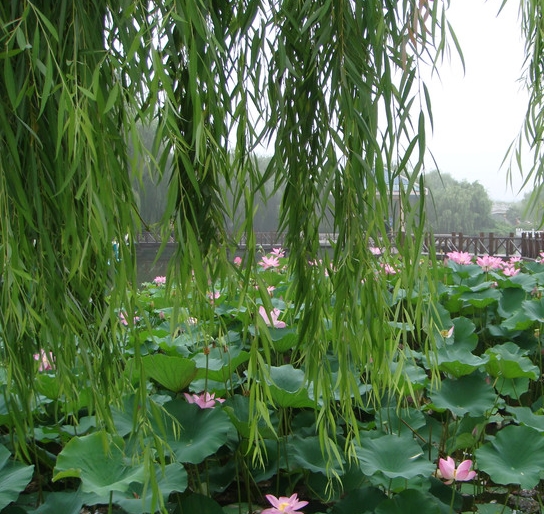 这两句“忽起”“垂杨舞”及垂杨叶上雨滴被风吹到荷叶上发出的万点声响等,表现了雨后池塘上的一种动态之美。 出自刘攽《雨后池上》 一雨池塘水面平,淡磨明镜照檐楹。 东风忽起垂杨舞,更作荷心万点声。 【译文】 春雨过后,池塘里涨满了水,几乎与地面相平。那平静的水面如淡磨的明镜,光亮耀人,倒映出屋檐下的梁柱。池边垂柳苍翠欲滴,忽然一阵春风拂过,万千杨柳枝条顿时袅娜地舞动起来。它们纷纷抖落一身晶莹的水珠,洒向那池中的荷叶,霎时传来很多清脆的响声。 名句研读 东风忽起垂杨舞 更作荷心万点声——雨停了,风住了,池边垂柳苍翠欲滴。忽然一阵风起,万千杨柳枝条袅娜飘动。杨柳似有知,风雨中洗尽污浊,欣喜中乘风起舞。舞动时抖落一身水珠,洒向池中荷叶,传来嗒嗒万点声。风狂雨骤时,杨柳枝条不停摆动不会引人注目,雨打荷叶响声一片也不会声声入耳。只有在风停雨住之后,一切归于沉寂,才会留意那突然风穿杨柳出现的舞动,才会捕捉到柳枝上的水珠抛向荷叶时发出的点点声响。由风起而垂杨舞,由垂杨舞而荷声万点的连锁反应,反映了作者雨后静观自然的怡然心态。 三、四两句用“忽起”、“垂杨舞”及垂杨叶上的雨滴被风吹到荷叶上发出的“万点”声响等,表现了雨后池上的一种动态之美。诗既写出了静态,又写出了动态,以静显动,又以动衬静,动静结合,组成了一幅雨后池塘春景图。 ![]() 【赏析】 这首诗展现在读者面前的是一幅雨后池塘图,从诗中写到的东风、垂杨、荷花等物象来看,背景是春季,因此,再确切些说是一幅雨后池塘春景图,给读者以清美的艺术享受。 诗既写出了静态,又写出了动态,以静显动,又以动衬静,动静结合,组成了一幅雨后池塘春景图。 首句展示的是雨后池上春景的静态美。第一句写雨后池塘水面的平静,只淡淡地出一“平”字。如果只读这一句,会觉得它过于平常,但在这句之后紧接以“淡磨明镜照檐楹”,却境界顿出。“淡磨”二字颇可玩味。施者是春雨,受者是池面,经春雨洗涤过的池面,好比经人轻磨拂拭过的明镜,比中有比,比中有拟人,这就使“水如镜”这一浅俗的比喻有新鲜之感。不仅能使读者感受到春雨后池上异常平静、明净的状态,并能进而联想到前此蒙蒙细雨随着微风轻拂池面的轻盈柔姿。“淡磨明镜照檐楹”,创造的正是非春雨后池塘莫属的艺术境界。与此相适应,这两句语势平缓,无一字不清静,连略带动感、略为经意的“淡磨”二字,也一如字面,给读者以一种轻淡的心理感受,显得毫不着力。 三四句由静而动,进一步写雨后池上的动态美。“东风忽起垂杨舞,更作荷心万点声。”雨停了,风住了,池边垂柳苍翠欲滴。忽然一阵风起,万千杨柳枝条袅娜飘动。杨柳似有知,风雨中洗尽污浊,欣喜中乘风起舞。舞动时抖落一身水珠,洒向池中荷叶,传来嗒嗒万点声。风狂雨骤时,杨柳枝条不停摆动不会引人注目,雨打荷叶响声一片也不会声声入耳。只有在风停雨住之后,一切归于沉寂,才会留意那突然风穿杨柳出现的舞动,才会捕捉到柳枝上的水珠抛向荷叶时发出的点点声响。 由风起而垂杨舞,由垂杨舞而荷声万点的连锁反应,反映了作者雨后静观自然的怡然心态。后二句则由静而动,写雨后池上的动态美。用“忽起”“垂杨舞”及垂杨叶上的雨滴被风吹到荷叶上发出的“万点”声响等,表现了雨后池上的一种动态之美。 这里,诗人笔下荡漾的东风、婆娑起舞的垂杨、荷心的万点声,无一不具有一种流动的韵致和盎然的生意,与前二句相比,别是一番情趣。与此相随,语势节奏也由平缓而转向急促,字字飞动起来。“忽起”二字,首先造成突兀之势,展示出景物瞬息间由静而动的变化,给人以强烈的动感;随后再用“更作”二字作呼应回旋,造成一种急促的旋律,从而把上述有形的与无形的、动态的和声响的景物联贯起来,组成一幅形声兼备的艺术画卷。 雨后池上景物之美,诗人既写其静态,又写其动态,不仅显得丰富多姿,而且构成对比,收到以静显动,以动衬静,相得益彰的艺术效果。首句平直叙起,次句从容承之,而以第三句为主,尽宛转变化工夫,再以第四句发之,诗人用这一方法巧妙安排,使语言结构形式与内容和谐统一,成因势置景、笔随景迁之妙。