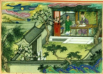 无题 晏殊 油壁香车不再逢,峡云无迹任西东。 梨花院落溶溶月,柳絮池塘淡淡风。 几日寂寥伤酒后,一番萧瑟禁烟中。 鱼书欲寄何由达,水远山长处处同。 【注】①峡:巫峡。峡云:即巫山女神故事。②禁烟:寒食节。③鱼书:书信。 (1) 这首诗的颔联历来被人称道,请你结合诗句,分析其被人称道的原因。 (2)“怨别”是这首诗的主旨,但通篇却不着一个“怨”字,请结合全诗简要分析这一特色。 参考答案: (1)示例:①寓情于景,情景交融(1分)。作者将一腔幽怨之情寄寓在暮春景象之中,营造了一个意境清幽、情致缠绵的境界(1分)。②“‘溶溶”“淡淡”等叠词的运用(1分),使诗句读起来朗朗上口,具有音韵美(1分)。(1分)③此联对仗工整(1分),韵律和谐(1分)。④用意象叠加(列锦)手法,通过梨花、院落、明月、柳絮、池塘、清风这六种意象的叠加,组成了一幅生动的画面(1分),营造缠绵幽怨的意境,倍增相思幽怨之情(1分)。⑤这两句互文见义(1分),院子里、池塘边,梨花和柳絮都沐浴在如水的月光之中(1分)。(答出两点即可,每点2分,酌情给分。答出运用借景抒情手法、对偶手法、动静结合手法,答对一点给1分。答描写了宁静、美好、和谐的画面,给1分) (2)示例:诗歌首联“不再逢”、“ 任西东”表现了与佳人无法再见的满怀惆怅,紧扣“怨”字(1分);颔联境界清幽,蕴含幽怨之情(1分);颈联“寂寥”、“ 萧索”直点怨情(1分);尾联书信无达处,则是怨的高潮(1分)。全诗紧扣“怨”字,却无一“怨”字,意在言外,含蓄蕴藉。(4分,酌情给分。要求:四联都举例分析,分析正确方可打满分。只分析一联的给1分。所举事例涉及两联的给2分,依此类推给分。答哀怨地送别友人给1分,答抒发了思念家乡的情感不给分) 译文1: 坐在油壁香车里的美丽女子再也见不到了,她就像峡上之云,行踪不定。院落里,梨花沐浴在如水一般的月光之中;池塘边,阵阵微风吹来,柳絮在空中飞舞。这几天寂寞得很,喝多了酒伤了身体,又是寒食禁烟日,更感到眼前一片萧索景象。我写好一封信,想寄给她,但不知如何才能够送到?你看水这般远,山这般长,到处都是高山远水阻隔,怎能送到此信! 译文2: 伊人乘著油壁香车而去无缘再逢,就像那巫山行云来无影去时无迹。 小院里梨花正开朦胧的月色溶溶,池塘畔柳絮飞舞一阵阵淡淡微风。 愧天来寂寞无聊更加上病酒之后,一次次萧索冷落又正值寒食节中。 本想写封信寄去无法送到她的手,山高路远彼此思念之情完全相同。 简释: 油壁香车:用油漆漆过装饰华丽的车子,古代为女子所乘,此处代指女子。禁烟:即寒食禁烟,古代风俗,清明前二日不举火,吃冷食物,谓之禁烟。鱼书:书信。古诗《饮马长城窟行》中有“呼儿烹鲤鱼,中有尺素书”句。晏殊有《鹊踏枝》词,中有“欲寄彩笺无尺素,山长水阔知何处”句。 晏殊简介: 晏殊(991—1055)字同叔,临川(今江西抚州) 人。幼孤,少有才名,七岁能文章。景德初,以神童荐,赐同进士出身。擢秘书省正字。历任太常寺奉礼郎。翰林学士,太子左庶子,加给事中,迁礼部侍郎、枢密副使。因论事忤太后旨,以刑部侍郎知宣州,改应天府。后为御史中丞,改兵部侍郎,兼秘书监,资政殿学士,翰林侍读学士。明道元年(1032) 迁参知政事,尚书左丞。庆历中官至加同中书门下平章事、集贤殿学士,兼枢密使。至和二年卒,年六十五,谥元献。晏殊“文章赡丽,应用不穷,尤工诗,闲雅有情思”(《宋史》本传)。其词擅长小令,多表现官僚士大夫的诗酒生活和闲情逸致。诗文集今已不传。有《珠玉词》三卷。 ![]() 赏析: 此诗是一首爱情诗,语言含蓄深沉,表达了诗人的无限深情。 首联“油壁香车不再逢,峡云无迹任西东”,油壁香车中的美丽的女子没有再相逢,“人面不知何处去”。诗人一生顺利,富贵优游,可能是以前出外踏青时遇此女子,短暂欢娱之后,分手话别,再也没有相逢。自宋玉《高唐赋》问世后,诗文里的“巫山云雨”变成情人欢聚的代名词,这里也是此意。 颔联“梨花院落溶溶月,柳絮池塘淡淡风”,点明了季节,是在春天,又点明了诗人此时的环境:月色溶溶,春风淡淡,梨花似雪,柳絮如烟,诗人独自站在寂寥空旷的院落里,池塘边,想起了往昔欢聚的佳人,不由地引起了诗人的伤春之情。这两句写得极工整,境界清冷,与诗人的心绪暗合。 颈联“几日寂寥伤酒后,一番萧瑟禁烟中”,几日来一直心系佳人,无由会晤,借酒浇愁,黯然神伤,尤其是在寒食的禁烟中更是凄凉酸楚,到此,诗人怀念佳人的深情刻画得淋漓尽致。 尾联“鱼书欲寄何由达,水远山长处处同”,几日来的相思无由排遣,自己形单影只,茕茕孑立,不由暗想:你在他乡还 好吗?想写封书信询问一下,又不知伊人身在何方,无法投寄,一个多情浪漫的诗人形象凸现出来。