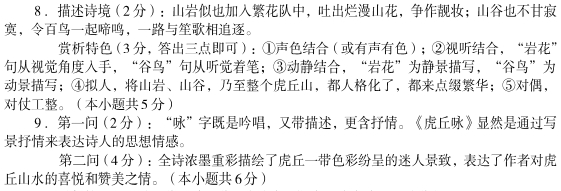 虎丘咏 黄省曾② 芙蓉近倚阖闾城,眺阁觞楼逐势城。 珠寺翻为歌舞地,青山尽是绮罗情。 岩花吐学红妆丽,谷鸟啼兼凤管声。 十里垂杨芳草岸,四时常映彩舟行。 【注】①虎丘:位于苏州城西北郊,相传春秋时吴王夫差葬其父阖闾于此,葬后三日有白虎踞其上,故名虎丘。还有一说是“丘如蹲虎,以形名”。《吴地记》载:“虎丘山绝岩纵壑,茂林深篁,为江左丘壑之表”,向有“吴中第一名胜”之誉。②黄省曾:明代著名学者和诗人,长于农业与畜牧,诗作以华艳取胜。 8.诗的颈联在写景上有哪些特色?请作简要赏析。(5分) 9.诗题中的“咏”字奠定了全诗怎样的情感基调?全诗表达了作者怎样的思想感情?(6分) 参考答案 ![]() 8、描述诗境:山岩似也加入繁花队伍,吐出烂漫山花,争做靓妆;山谷也不甘寂寞,令百鸟一起啼鸣,一路与笙歌相追逐。 ①声色结合 ②视听结合 ③动静结合 ④拟人:将山岩、山谷、虎丘山拟人化,都来点缀繁花;⑤对偶 9、“咏”字既是吟唱,又是描述,更含抒情。《虎丘咏》显然是通过写景抒情来表达诗人的思想感情。全诗浓墨重彩描绘了虎丘一带色彩纷呈的迷人景色,表达作者对虎丘山景的喜爱和赞美之情。