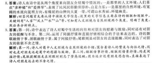 送友人尉蜀中 唐 徐晶 故友汉中尉,请为西蜀吟。 人家多种橘,风土爱弹琴。 水向昆明阔,山连大夏深。 理闲无别事,时寄一登临。 注:蜀中:和诗中的汉中、西蜀,昆明,大夏均为古代中国地名。 1、诗人在诗中从哪些方面向朋友介绍了蜀中的情况,请简要概括。 2、诗中表达了诗人怎样的思想感情,用了哪些表现手法来表达的。 参考答案 1、诗人在诗中是从两个角度来向朋友介绍蜀中情况的:一是那里的人文环境,人们喜欢“多种橘”和“爱弹琴”,表现了民风民俗勤劳淳朴,自足自乐;一是那里的自然环境,有宽阔的水流向昆明方向,有绵延的山伸向大夏一带,可谓山水秀丽,环境幽美。 2、第一问;诗中表达了诗人对蜀中生活的向往和对朋友的慰藉与鼓励,同时还有对朋友的提醒和不舍。第二问运用了间接抒情和直接抒情相结合的手法来表达的。诗的颔联融情于事,颈联融情于景;尾联则是对朋友的直接提醒,同时表达了对朋友的依依不舍之情。 ![]()