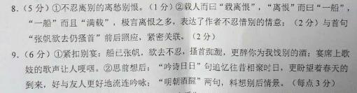 虞美人 大光祖席,醉中赋长短句 陈与义 张帆欲去仍搔首,更醉君家酒。吟诗日日待春风,及至桃花开后却匆匆。 歌声频为行人咽,记著樽前雪。明朝酒醒大江流,满载一船离恨向衡州。 (1)词的上阕写出了怎样的情景?请简要分析。 答:上阕写出了江边饯别的情景。(2分)船已挂帆,人却难舍难离,美酒更添离愁别绪;追忆以前,天天吟诗唱和期盼春天,谁知桃花开过就要与友人匆匆离别。(3分) (2) 这首词写景有什么特点?请简要分析。 答:①意象丰富,意境清丽。“张帆”“醉酒”“歌声”“大江”“一船”等意象,丰富了离别的画面,“待春风”“桃花开后”清新自然,饱含深情。(3分)②运用想象,虚实结合。过去、眼前与想象相融合,把离别境况描绘得如历历在目,把离别情感表达得委婉深沉。 二 8、末句“满载一船离恨向衡州”表现了词人什么样的情绪?是如何表现的?请简要阐述。 9、这首词的写法是“紧扣别宴,思前想后”,请结合全词简要分析。 参考答案 8.不忍离别的离愁别恨。 ![]() 赏析 词的上片由别宴写起,进而追忆到过去相聚的时日。词的下片仍写别宴。词人因歌而记着歌者,即记着此别,记着饯别的主人,一语而三得。 这首词的写法是:“紧扣别宴,思前想后”。他把离别的情绪融贯到对过去的回忆和对前途的想像之中去,不同一般,别有一番风味。 词的上片由别宴写起,进而追忆到过去相聚的时日。一开篇就说船已经挂起帆来了准备离去,久久不能离去,只是一杯杯地饮着好友送别的酒。这就把不得不离去又不忍离去的矛盾心理形象地表现出来。为什么“张帆欲去”?因为“携家作客真无策”、“长乘舴艋竟安归?”(《元日》)词人在战乱之中,携家南奔,屡次寄居,终非长策,但却非走不可。为什么“仍搔首”?因为与义和大光友情诚笃,不忍分别,所以搔首踟蹰。这里词人很自然地追忆起在腊月间相聚的时日,朋友们饮酒赋诗;同时,更盼望着春天的到来,以与友人更好地流连吟咏,然而春天到了,桃花才吐蕊,而自己却要与友人告别了!“匆匆”之中,包含了无限惜别之意。“吟诗”两句,清刘熙载《艺概·词曲概》赞为“好在句中”,就是说其本身即为佳句,不待上下文关照,自然映发,自见妙处。 词的下片仍写别宴。写过了酒,紧接着从歌上落笔。古人送别时唱“骊歌”,如苏轼《江城子。孤山竹阁送述古》所写“且尽一樽,收泪听《阳关》”宋代州郡长官设宴,有官妓陪侍,歌舞酒声远远飘去,可见宴会的盛大,此“歌声”就是歌妓所唱。“歌声频为行人咽”,临别之际,歌妓也为之动情,几度呜咽不能成声。因此感动了词人:“记著樽前雪”。“雪”为“雪儿”省略,而“雪儿”又是指代歌妓的。雪儿为隋末李密歌姬,善歌舞,能够根据音律填词而歌,称“雪儿歌”,后来泛指歌妓。词人因歌而记着歌者,即记着此别,记着饯别的主人,一语而三得。酒醉人,而歌声也足以醉人。“明朝酒醒大江流”,此笔回旋一转,想到明朝酒醒之后,此身已随舟漂泊到湘江。此行何去?相距一百二十里的衡州(今衡阳)是第一站。 “满载一船离恨向衡州”:载人而曰“载离恨”,“离恨”而曰“一船”,“一船”而且“满载”,即满载离恨表达了作者不忍惜别的情意,与首句“张帆欲去仍搔首”紧密关连,也同《别大光》诗的“滔滔江受风,耿耿客孤发”相补衬。这最后两句,化用苏轼在扬州别秦观的《虞美人》词的“无情汴水自东流,只载一船离恨向西州”,而这里情感更为丰富。运用前人成句时切忌字句意义完全相同,但又不可距原句意思过远。与义此处构句可谓运用前人之后,却自然切合己事,变化处又别出心裁,较之上片之结,艺术上也不相上下。