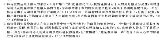 春 雪 韩愈 新年都未有芳华, 二月初惊见草芽。 白雪却嫌春色晚, 故穿庭树作飞花。 到京师 杨载 城雪初消荠菜生,角门深巷少人行。 柳梢听得黄鹂语,此是春来第一声。 8、两首诗的最后两句写景,各运用了什么艺术手法?请简要分析。 9、两首诗都抒写了诗人惊喜之情,请结合诗句简要分析。 参考答案 8.韩诗主要运用了拟人的手法,杨诗运用了以动衬静的手法。 9.韩诗前两句描绘出诗人在焦急的期待中终于见到“春色”的萌芽的惊喜神情。杨诗写诗人初到京城虽然环境寂静落寞,但“黄鹂语”、“此是春来第一声”表现了诗人心中的惊喜之情,以及对于进仕的满腔希望。