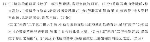 穿山① 吴伟业② 势削悬崖断,根移怒雨来。 洞深山转伏,石尽海方开。 废寺三盘磴,孤云五尺台。 苍然飞动意,未肯卧蒿莱。 【注】①穿山,诗人故乡江苏太仓海边的一座山,山中有石洞可穿行。②吴伟业,晚明诗人。这首诗写于作者青年时期。 (1)诗歌的前两联描绘了一幅怎样的画面?请结合诗句分析。(4分) (2)赏析“未肯”一词在诗中的妙处。(4分) 参考答案 (1)诗歌的前两联描绘了一幅气势磅礴、高迈空阔的画面。 (2)未肯二字运用拟人手法,生动形象地描绘出那苍然斜耸的石台,虽与“废寺”为邻却不甘心被荒草掩埋的姿态,突出了石台的孤傲不驯。