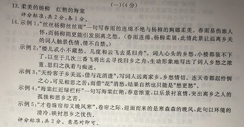 虞美人·梳楼 [宋]蒋捷 丝丝杨柳丝丝雨。春在溟濛处。楼儿忒小不藏愁。几度和云飞去、觅归舟。 天怜客子乡关远。借与花消遣。海棠红近绿阑干。才卷朱帘却又、晚风寒。 (选自《宋词鉴赏辞典》) 【注释】①溟濛(míng méng):形容烟雾弥漫,景色模糊。②忒(tuī):太。 13.这首词中作者选取了绵绵的细雨、 ▲ 和 ▲ 等自然景物,描绘出江南春天的景致。(2分) 14.这首词抒发了作者思归念远之情,请选取你感受最深的一处进行分析。(2分) 参考答案 13.柔美的杨柳 红艳的海棠 14.“丝丝杨柳丝丝雨”一句写春雨的连绵不绝与杨柳的婀娜柔美,春雨易伤旅人怀,而杨柳则更能引发别离之愁。(春雨连绵、杨柳柔展,此情此景让远离乡关的词人触景伤情、情不自禁。) ![]()