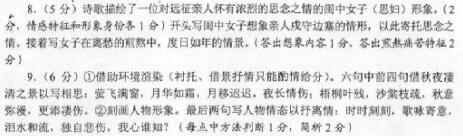 塞下曲六首(其四) 【唐】李白 白马黄金塞,云砂绕梦思。 那堪愁苦节,远忆边城儿。 萤飞秋窗满,月度霜闺迟。 摧残梧桐叶,萧飒沙棠枝。 无时独不见,流泪空自知。 【注】①云砂:亦作“云沙”,指白云和黄沙,借指边塞风光或边塞地区。②沙棠:植物名,果实味道像李子。③独不见:为乐府古题,吟诵的是思而不得见的情绪。 8.全诗描绘了一个怎样的人物形象?请简要分析。(5分) 9.诗歌最后六句是如何表现相思情感的?请简要分析。(6分) 参考答案 8、诗中描绘了一位对远征亲人怀有浓烈的思念之情的闺中女子形象。开头写闺中女子想象亲人戍守边塞的情形,以此寄托思念之情,接着写女子在熟悉的煎熬中,度日如年的情景。 9、借助环境渲染。六句中前四句借秋夜凄清之景以写相思;萤飞满窗,月华如霜,月移迟迟,夜长情伤,梧桐叶残,沙棠枝疏,秋意弥漫,更添凄伤。刻画人物形象。最后两句写人物情态以抒离情;时时刻刻,歌咏寄意,泪水和流,独自悲伤,我心谁知? ![]()