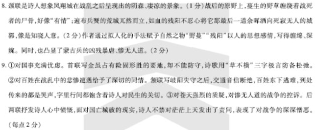 岐阳三首(其二) 元好问 百二关河草不橫②,十年戎马暗秦京③。 岐阳西望无来信,泼水东流闻哭声; 野蔓有情萦战骨,残阳何意照空威。 从谁细向苍苍问,争遣蚩尤作无兵。 【注】①本诗作于蒙古破金凤翔一役及其前后之时,当时作者在金汴京域中任职。岐阳,当时属凤翔府。②百二关河:以二敌百的险要地方。草不横:草未经车马践踏偃倒。 ③十年戎马:金兴定五年(1221)元军进攻陕北,到凤翔陷落,共计十一年。秦京:咸阳,这里泛指秦(陕西)地。④争:怎,为什么。蚩(chi)尤:这里代指元军。五兵:各种兵器,这里指发动战争。 8.该诗的颈联历来被人称道,请加以赏析。(5分) 9.这首诗歌蕴含的思想感情丰富,请简要分析。(6分) 参考答案 8、颈联是诗人想象凤翔城在战乱之后呈现出的阴森、凄凉的景象。战后的原野上,蔓生的野草缠绕着战死者的尸骨,好像“有情”; 9、对国事充满忧虑。对百姓在战乱中的悲惨遭遇给予深切的同情。对苍天强烈的质疑,对惨无人道的战争的控诉。后两联抒发诗人心中的愤慨,面对国亡城破的现实,诗人不禁对茫茫上天发出了责问,表现了对战争深深憎恶。 ![]() 参考译文 号称“百二关河”的三秦啊,如今已不见杂草纵横;十年的战火燃烧在这里,烽烟遮暗了旧时的秦京。西望着岐阳啊,全没有半点同胞的音信;东流的陇水啊,只听到一片惨痛的哭声!荒野里,缠绵的蔓草情深意厚,在悄悄萦绕着战士的尸骨;蓝天下,惨淡的残阳究竟为啥,却偏偏照射着死寂的空城?我能够从什么地方啊,向苍天细细地责问——为何让凶残的蚩尤啊,制造这杀人的刀兵? 赏析 《岐阳》写于金代末年。当时金国面临的强敌是蒙古汗国。成吉思汗于公元1219年发动西征,把版图扩展到中亚和欧洲以后,即致力于南侵。1227年农历六月消灭了建国达190年之久的西夏,前锋直达凤翔(岐阳)。但七月成吉思汗在距离凤翔不远的今甘肃清水县病死。继承汗位的窝阔台于1231年初再次围攻凤翔,农历二月凤翔陷落。蒙古兵围攻岐阳,四月城破,作者时任南阳县令,闻变写《岐阳》三首。《岐阳》即写于公元1321年二月前后。 《岐阳》是宋代元好问创作的组诗。第二首写岐阳之役的惨状,控诉蒙古军残杀无辜的暴行,包含着诗人深沉的悲愤。 “百二关河草不横,十年戎马暗秦京”。元好问身在南阳,却心系失陷的岐阳,写岐阳失陷,又回顾了十年战乱带来的惨状,可谓思绪悠长。“暗”字巧妙渲染出战地暗无天日的场面。 “岐阳西望无来信,陇水东流闻哭声”。诗句从“望”字生发开去,望中已知音讯断绝,望中如闻陇水呜咽,望中悬想沦陷中的岐阳,从而为下面对岐阳空城的描述作了铺垫。 “野蔓有情萦战骨,残阳何意照空城”。这两句情感极其低沉悲痛。江淹《恨赋》:“试望平原,蔓草萦骨。”元好问在本诗中加入“有情”二字,使自在生长的野蔓草也变得灵动起来,而且还注入了感情的力度,可谓力透纸背。接下来,面对夕阳残照的空城,作者呼天抢地,责问蒙古军屠城罪行。人们读后,不禁一陲魂颤。 “从谁细向苍苍问,争遣蚩尤作五兵”。如果说上一句的质问还比较笼统,这一句的质问就落到实处了。诗人责问上苍,痛恨蚩尤,表现出对黎民百姓的深切同情和对惨无人道战争的极端憎恨。 诗重在写实,但不用工笔细描,而是大笔勾勒,诗人选取几组典型意象,并用一些扣人心弦的动词,把这些意象组合成一幅动态画面,比如:用一“萦”把野蔓与战骨组合起来;用一“照”把残阳与空城组合起来,从而产生一种超越时空的艺术效果。