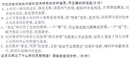 虞美人·雨后同干誉才卿置酒来禽花下作 叶梦得 落花已作风前舞,又送黄昏雨。晓来庭院半残红,惟有游丝千丈、罥晴空。 殷勤花下同携手,更尽杯中酒。美人不用敛蛾眉,我亦多情无奈、酒阑时。 注 干誉、才卿:皆叶梦得友人,生平事迹不详。来禽:林檎别名,南方称花红,北方称沙果。 残红:凋残的花。 罥(juàn):缠绕。 殷勤:情意深厚。 蛾(é)眉:螺子黛,乃女子涂眉之颜料,其色青黑,或以代眉毛。眉细如蛾须,乃谓蛾眉。更有以眉代指美人者。 ![]() 这首词表达了什么样的思想情感?请结合全词分析。 参考答案 1. A3分,D2分(A “游丝”指的是天上的云丝,意境不是凄清迷蒙。D.“实际上表达了词人与情人分别时内心的伤感与无奈”错。) 2. ①惜花伤春的情怀。上片风雨摧残落花,残红满院,透出伤春之情。 ②对雨后初晴美景的喜爱。雨后初晴,天空云丝飘荡,更显晴空辽阔高旷,乐景写乐情。 ③与朋友聚饮的喜悦。(与朋友的深情厚谊)雨后初晴,词人花下置酒,殷勤劝酒。 ④宴终人散的伤感。最后两句借劝慰美人,委婉地说出了“酒阑”之后曲终人散的伤感。(每点2分,答出任意3点即可。意思对即可。) 简析 此词写同友人饮酒赏花之情景。上片写花已落矣,犹作风前舞,更送黄昏雨,花多情,游丝亦多情。下阕写花下共饮,是友人之多情;对花敛蛾眉,是美人之多情。层层进逼,“我”亦多情。全词寓意丰厚,情致深曲。 这首小词以健笔写柔情,以豪放衬婉约,颇得东坡婉约词之妙。 上片写景,景中宴情。昨夜一场风雨,落花无数。晓来天气放晴,庭院中半是残花。内容极为简单,写来却有层次,且有气势。从时间来看,重点清晨,也即“晓来”之际;昨夜景象是从回忆中反映出来的。意境颇类李清照《武陵春》“风住尘香花已尽”,但李词较凝炼,叶词较舒展。一般写落花,都很哀婉低沉,如欧阳修《蝶恋花》“泪眼问花花不语,乱红飞过秋千去”,秦观《千秋岁》“春去也,飞红万点愁如海”,均极凄婉之致。可是这里却用另一种手法,不说风雨无情,摧残落花,而以落花为主语,说它风前飞舞,把“黄昏雨”给送走了。创意甚新,格调亦雅。晓来残红满院,本易怅触愁情,然词人添上一句“唯有游丝千丈晴空”,情绪遂随物象扬起,高骞明朗,音调也就高亢起来。 下片抒情,情真意切。前二句正面点题,写词人雨后同干誉、才卿两位友人来禽花下饮酒。“殷勤花下同携手”,写主人情意之厚,友朋感情之深,语言简练通俗而富于形象性,令人仿佛看到这位贤主人殷勤地拉着干誉、才卿入座。还“更尽杯中酒”,一方面见出主人殷勤劝饮,犹如王维《送元二使安西》中所说的“劝君更净杯酒”;一方面也显出词情的豪放,如欧阳修《朝中措》中所写的“挥毫万字,一饮千钟”。结尾二句写得最为婉转深刻,曲折有味。古代达官、名士饮酒,通常有侍女或歌妓侑觞。此云“美人不用敛蛾眉,我亦多情无奈酒阑时”,“美人”即指侍女或歌妓而言,意为美人愁眉不展,即引起我不欢。其中“酒阑时”乃此二句之规定情境。酒阑意味着人散,人散必将引起留恋、惜别的情怀,因而美人为此而敛起蛾眉,词人也因之受到感染,故而设身处地,巧语宽慰,几有同其悲欢慨。