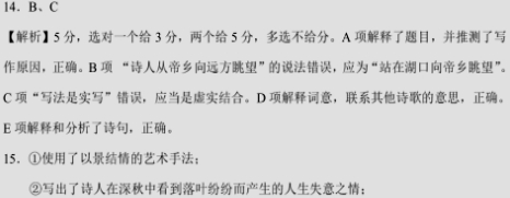 晚次湖口有怀(节选) 刘长卿 帝乡劳想望,万里心来去。 白发生扁舟,沧波满归路。 秋风今已至,日夜雁南度。 木叶辞洞庭,纷纷落无数。 14.下面对这首诗的理解和分析,不恰当的两项是(5分) A.诗人夜晚在湖口这个地方住宿,看到秋天的湖光水色,心中有感而写下这首诗。 B.首句是即景抒情,诗人从帝乡向远方眺望,想象自己将踏上长达万里的路程。 C.“白发”在古人眼里象征年老,“沧波”则是眼前的湖水,三四两句的写法是实写。 D.诗句中的“扁舟”跟“今夜谁家扁舟子”“明朝散发弄扁舟”中的“扁舟”均指小船。 E.大雁在秋天不分昼夜向南迁徙,发出阵阵叫声,让诗人难以入眠,增添了许多愁情。 15.诗歌的尾联耐入寻味,请赏析其艺术效果。(6分) 参考答案 14、BC 15、(1)使用了以景结情的艺术手法;(2)写出了诗人在深秋中看到落叶纷纷而产生的人生失意之情;(3)表达了诗人身在异乡而难归的孤寂。 ![]() 附全诗 霭然空水合,目极平江暮。南望天无涯,孤帆落何处。 顷为衡湘客,颇见湖山趣。朝气和楚云,夕阳映江树。 帝乡劳想望,万里心来去。白发生扁舟,沧波满归路。 秋风今已至,日夜雁南度。木叶辞洞庭,纷纷落无数。