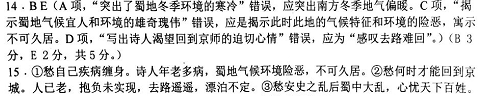 又雪 杜甫 南雪不到地,青崖沾未消。 微微向日薄,脉脉去人遥。 冬热鸳鸯病,峡深豺虎骄。 愁边有江水,焉得北之朝。 注:公元765年,杜甫离开草堂,顺江而下,因病暂住云安(今重庆云阳)。 14﹒下列对本诗有关内容的解说和鉴赏,最恰当的两项是(5分) A﹒首联描写了南方雪景,一个“沾”字传神地写出了南方积雪湿重不够蓬松的特点,突出了蜀地冬季环境的寒冷。 B﹒颔联连用两个叠音词“微微”“脉脉”,栩栩如生地描绘出雪仿佛在含情脉脉地离人远去,表达了诗人对蜀地的眷恋。 C﹒颈联“冬热”两句,通过“鸳鸯”“犲虎”对比揭示蜀地气候宜人和环境的雄奇瑰伟,也为末句写北归长安作铺垫。 D﹒尾联中“焉得北之朝”中的“北之朝”应指诗人向北回到京城长安,“焉得”二字写出诗人渴望回到京师的迫切心情。 E﹒诗人以“又雪”为题,摹景状物,情景交融,极富神韵。全诗语言朴实,刻画细致入微,诗人疾病缠身,寄托遥深。 15﹒“愁边有江水”,诗人忧愁如汩汩江水。请结合全诗分析诗人的“愁”。(6分) 参考答案 14、BE 15、愁自己疾病缠身。愁何时才能回到京城。愁安史之乱后蜀中大乱,心忧天下百姓。 ![]() 简析:借景抒情,表达了作者心忧天下,关心民间疾苦之情。