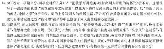 水调歌头 叶梦得① 秋色渐将晚,霜信报黄花。小窗低户深映,微路绕鬓斜。为问山翁何事,坐看流年轻度,拚②却鬓双华。徙倚望沧海,天净水明霞。 念平昔,空飘荡,遍天涯。归来三径重扫,松竹本吾家。却恨悲风时起,冉冉云间新雁,边马怨胡笳。谁似东山③老,谈笑静胡沙! 【注】①叶梦得(1077~1148),南宋词人。靖康之难前,叶梦得几次因得罪宦官而落职闲居。晚年隐居湖州太湖。②拚(pàn):舍弃。③东山:东晋名相谢安曾从隐居的东山进入仕途并取得淝水之战的胜利。 10.词的上阙前四句写了什么样的景象?有什么作用?(5分) 11.根据下阙,概括诗人表达的复杂情感。(6分) 参考答案 10.①诗人描绘了黄花开、霜降至、户窗掩映、山路盘曲的秋日傍晚清幽僻静的景象。(2分。景物描述1分,特点概括1分);②交代了诗人山居生活环境,(1分)渲染了幽清孤寂的氛围,(1分)为下文抒发复杂的内心情感作铺垫。(1分)(按点给分,共5分) 11.①壮志难酬(英雄空老)的感喟之情;②归隐山水的无奈之情;(1分)③无法忘怀国家安危,时刻惦念抗金战事的矛盾之情(对……的关切之情);(2分)④对朝政腐朽无能的愤懑之情。(2分)(按点给分,共6分) 二 14.下列对这首词的赏析,不正确的两项是(5分) A.上片起首两句点明时令。黄花盛开报来了霜降的消息,正是秋高气爽的时候。写秋景,一般多写得萧瑟、衰飒,这里却把秋景写得艳美,映衬出词人开朗的胸怀。 B.三、四两句,点明住地幽静偏僻:简朴的房子掩映在黄花丛中,外边环绕着蜿蜒的小道。很适合过隐居生活。为后文“为问”委婉曲折、沉重感喟的抒发作铺垫。 C.上片末两句写词人来到了太湖边上,凝视着浩茫无际的沧海一般的湖波,天宇澄净,绮丽的彩霞在波光里闪动。望“海”“天”“霞”展现了词人的闲适、冲淡之意。 D.下片前三句词人从空间上再一次感叹一事无成。“归来”两句化用陶渊明《归去来兮辞》“三径就荒,松菊犹存”。“本”字更加表现出词人归隐的决心。 E.词作上片和下片的表达方式有些不同,上片写景叙事,下片于叙事写景之中,抒情较为集中,用典老道。全词景物切换自然,词气清淡而情意真切。 15.叶梦得开拓了南宋前半期以“气”入词的词坛新路,主要表现为“英雄气”“狂放气”“隐逸气”。请结合这首词,任选两种试作赏析。(6分) 参考答案 ![]() 赏析 这首词是作者晚年退居卞山所作。它是一首自叙平生、抒写情怀的词。表达了作者心中的悲愤之情和对国事担忧。 词分上下两片。上片以写景为主,兼寓流年虚度的慨叹。 “秋色渐将晚,霜信报黄花。”词的第一个字“秋”,点明时序,是泛指。然后再具体写秋色。“晚”字是形象的说法,它既不是“来得晚”的意思,也不是确指“晚上”,而是由“老”引伸出来的含意。意思是说,暮秋的景物渐渐地呈现出苍老深暗的颜色了。伴随深秋而来的,自然是凛冽的冰霜,以及那“颜色只从霜后好,不知人世有春风”性本高洁的菊花,即词里所说的黄花。黄花开,霜降至。 “小窗低户深映,微路绕敧斜。”“小窗低户”形容房屋简陋,敧斜即倾斜的意思。这两句是说,简陋的小屋掩映于秋色黄花之中,屋前是曲折倾斜的小路。这里既写出了环境的幽清孤寂,也由门前的曲折小路折射出作者的九曲愁肠。 “为间山翁何事,坐看流年轻度,拚却鬓双华。”“为”在这里作助词用,没有实在意义。山翁指晋代山简,”这里作者以山简自比。拚却是甘愿的意思。这里有反洁意,是说“难道甘愿”。双鬓华:指年事已高,两鬓生霜。它与上边的“霜信报黄花”有着巧妙的内在联系。前者写秋色将晚,后者写人近晚年。作者以山翁自比。前加“问”字,说明他不甘寂寞,时时在反躬自省。言外之意是我每天干些什么呢?白白地看着年华轻易逝去,这是何等痛心的事情!国难当头,我能甘心服老吗? “徙倚望沧海,天净水明霞”。这一句真实地记录了他经过反复的思考后此刻的开阔心境。徙倚是留连徘徊的意思。沧海即大海,作者以谢安自比,明显地表达了他对谢安不甘示芜的小路,观赏观赏自家的青松翠竹,看似悠弱、泛海东还的退隐之志的仰慕与追求。“天净水明霞”则是眼前美景的写照,以此衬托出他一旦有了明确的人生追求之后的开阔心胸:如秋天长空那样纯净,如霞映水中那样明丽。这短短的几个字,看似平平淡淡,内容却实实在在。既写了体现诗词形象的人,又写了水天明净的景;既写了流连徘徊的貌,又写了泛滥于内心深处的情。情中见景,景中含情,可谓浑然一体了。 下片直抒胸怀。写虽然在家闲居,却对国事深怀忡忡忧心,自恨不能为国建功立业。 “念平昔,空飘荡,遍天涯。”三字一句,短促有力,如响板敲来,铿然有声,抒发了作者回想往事,空在四方飘游而无所成就的自责自罪、自怨自艾的怅惘心情。“空飘荡,遍天涯”既显示了他的谦谨胸怀,又委婉地传达出他企望重操旧业、再立新功的心声。 “归来三径重扫,松竹本吾家。”写的是闲居生活的无聊小事。作者写自己:每天在庭院中扫扫荒芜的小路,观赏观赏自家的青松翠竹,看似悠闲自在,实则这绝不是他心甘情愿的。 “却恨悲风时起,冉冉云间新雁,边马怨胡茄。”悲风指凄厉的寒风。却恨是更恨的意思。“悲风”之前加上“却恨”,强化了词人的情感波澜,即由怅惘不安进而愤愤不平了。为什么?因为冉冉飞翔于白云之间的新雁带来了敌人