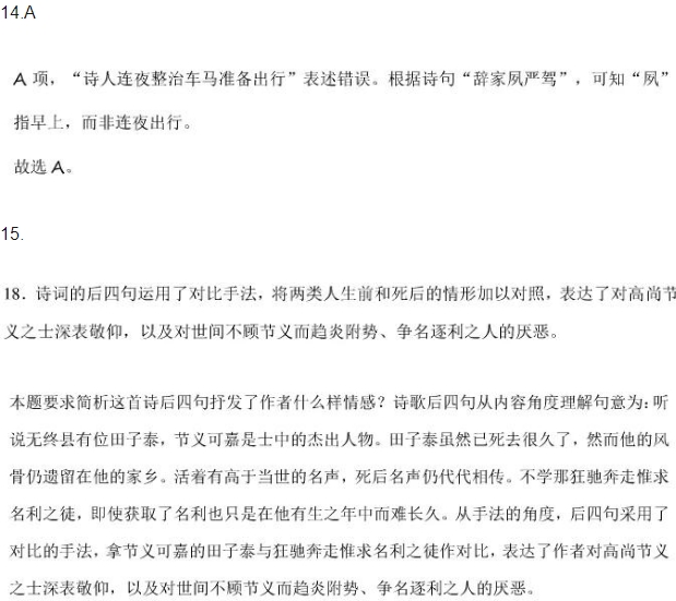 拟古·辞家夙严驾 陶渊明 辞家夙严驾,当往志无终。 问君今何行,非商复非戎。 闻有田子泰,节义为士雄。 斯人久已死,乡里习其风。 生有高世名,既没传无穷。 不学狂驰子,直在百年中。 【注释】(1)无终:古县名,在今河北省蓟县。(2)田子泰:即田畴,字子泰,东汉无终人。田畴隐居于 徐无山中,选择了一块地处险远又很平敞的空地居住,亲自耕种粮食用来供养父母。归附他的百姓有五千多家, 他就定法纪、办学校,使这地方安定太平。(3)狂驰子:指为争名逐利而疯狂奔走的人。 14.下列对这首诗歌的赏析,不正确的一项是( )(3 分) A.听说田子泰的事迹后,诗人连夜整治车马准备出行,可见诗人急于体验田子泰的流风余韵。 B.诗人到无终县去,既不是经商做买卖,也不是在那里从军,而是想效仿田子泰成就自己的理想。 C.这首诗运用了对比手法,将两类人生前和死后的情形加以对照,表达了强烈的爱憎情感。 D.这首诗通过写诗人整装远访田子泰故乡来寄寓情怀,所传达的思想与《桃花源记》有相通之处。 15.这首诗后四句抒发了作者什么情感?请简析。(6 分) 答 14、A 诗人连夜整治车马准备出行 错误。夙 指早上,而非连夜出行。 15、诗词的后四句运用了对比手法,将两类人生前和死后的情形加以对照,表达了对高尚节义之士深表敬仰,以及对世间不顾节义而趋炎附势、争名逐利之人的厌恶。