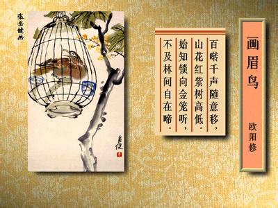 画眉鸟 [宋]欧阳修 百啭千声随意移,山花红紫树高低。 始知锁向金笼听,不及林间自在啼。 相关试题及阅读答案 1、本诗运用的主要表现手法及作用是什么?试加以简要分析。 解题思路: ①这首诗用的主要表现手法是对比。 ②前两句(写自由自在,任意翔鸣的画眉)与后两句(写陷入囚笼,失去了自由的画眉)构成对比。 ③表明自己对田园生活的喜爱、向往,同时表达对官场生活的厌恶。 答案: 这首诗运用了对比手法,前两句(写自由自在,任意翔鸣的画眉)与后两句(写陷入囚笼,失去了自由的画眉)构成对比,结构明晰。表明自己对田园生活的喜爱、向往,同时表达对官场生活的厌恶。 2、本诗表现手法上最突出的特点是什么?从诗中能领悟到诗人怎样的思想感情? 答:借物咏怀 林中鸟与笼中鸟不同境遇的对比手法 。 表达了对自由的热情赞美,对束缚个性、禁锢思想、窒息性灵的憎恶和否定。 3、这首诗写了几种画眉鸟?是用什么手法表现的?(4分) 答:这首诗写了两种画眉鸟,一是林中的,一是笼中的。(1分)作者用对比的手法描写画眉鸟。(1分)前者在林中“随意移”、“自在啼”,自由自在(1分);后者锁于金笼之中,完全没有自由(1分)。 4、作者写画眉鸟,表达了怎样的思想感情?(4分) 答:这首诗借鸟抒怀(2分),表达了对自由的赞美之情(1分)和对束缚个性、窒息性灵的憎恶之意(1分) 二: ①前两句表现什么内容: 答:描绘了画眉鸟在山林间的美好形象:自由自在,百啭千啼;山花烂漫,姹紫嫣红;画眉鸟翻飞于高高低低的树间,恣意欢畅。 ②后两句用了什么手法来表达诗人的思想感情的: 答:诗人运用对比的手法,表达了对自由的赞美与追求的思想感情。 译文: 山林中的画眉鸟自由飞翔、到处欢畅, 任它在山花烂漫的高矮树丛中腾跃。 这时我才感觉到即使用金笼子来养它, 也不如由它自由自在的啼啭惬意。 ![]() 赏析: 这是一首咏物诗,既不同于咏花赏乌的消闲之作,又有别于一般咏物寄情的诗,它本是一首含有深邃理趣的哲理诗。诗中通过对画眉乌自由生活的赞美,抒发了诗人贬官外任后的忧郁情怀.表现了诗人向往和追求自由生活的热切愿望。同时,也表达了诗人对束缚个性、压抑人才的种种拘系与禁钢的强烈憎恶和否定。 这是。首追求人生自由的颂歌。诗中既有浓郁的济味,又有深邃的理趣。堪称一首真正的哲理诗。其主要特点有: 首先,情、景、理三者结合.理趣盎然。全诗四句、前二句写景,景中寓理;后二句言理,理不离景。而景和理又都体现并贯穿着诗人赞美大自然和追求自由的充沛热情,这种热情洋溢在全疗的字里行间。使情、景、理三者融合。既不离诗的特质,又富有意趣情韵,使诗味和理趣熔于一炉、不仅给人以艺术上的享受.而且能给人以思想上的启迪。 其次,以物喻人,寓意深远。这首诗表面上是写画眉乌,实际上是在写入。诗中以“金笼”喻官场,以鸟“锁向金笼听”,比喻官场的受束缚和不自由;又以鸟在“林间自在啼”,比喻摆脱官场后的自由和快乐。采取这种以物喻人的写法,蕴含丰富,寓义深远,收到了良好的艺术效果。 ![]() 最后,对比鲜明,反差强烈。前二句,通过声音与色彩的对比,描绘出山林中一种自由无拘、生机勃勃的景象:画眉乌自由自在,鸣声婉转动,人,其生存环境又是那样美好。作者这种写法的真正用意,在于和后二句构成鲜明的对比。而后二句又通过“金笼”与“山间”的对比,说明了“锁向金笼听”远远不如“山间自在啼”的歌声优美,其原因就在它受到拘禁,失掉了自由。这样, “锁向金笼”四个字,与前二句描写的景象形成了强烈的反差,诗人由此抒发了深长的感慨,呼唤自由,歌唱自由,追求自由,使自由成为全诗的主旋律。巧妙地运用对比手法,对照分明,反差强烈,有利于突出诗歌的主旨。