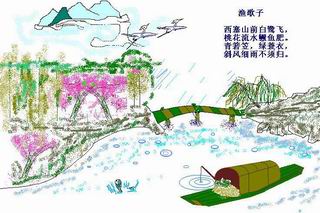 西塞山前白鹭飞,桃花流水鳜鱼肥。 青箬笠,绿蓑衣,斜风细雨不须归。 注释 渔歌子:原是曲调名,后来人们根据它填词,又成为词牌名。 西塞山:在今浙江省湖州市西面。 白鹭:一种白色的水鸟。 桃花流水:桃花盛开的季节正是春水盛涨的时候,俗称桃花汛或桃花水。鳜鱼:俗称“花鱼”、“桂鱼”。扁平、口大、鳞细、黄绿色,味道鲜美。 箬笠:用竹篾、箬叶编的斗笠。 蓑衣:用草或棕麻编织的雨衣。 ![]() 译文 西塞山前白鹭在自由地飞翔,江岸桃花盛开,春水初涨,水中鳜鱼肥美。渔翁头戴青色的箬笠,身披绿色的蓑衣,冒着斜风细雨,乐然垂钓,用不着回家。 赏析: 《渔歌子·西塞山前白鹭飞》是唐代诗人张志和的一首词。这首词开头两句写垂钓的地方和季节。这两句里,出现了山、水、鸟、花、鱼,勾勒了一个垂钓的优美环境,为人物出场作好了铺垫。词的后两句写烟波上垂钓。尾句里的“斜风细雨”既是实写景物,又另含深意。这首词通过对自然风光和渔人垂钓的赞美,表现了作者向往自由生活的心情。 西塞山在今浙江省吴兴县境内的西苕溪上,从前叫道士矶,是一座突出在河边的大石岩。西苕溪北通太湖,南邻莫干山,风景很优美。张志和这首词描绘春汛期的景物,反映了太湖流域水乡的可爱。 白鹭就是平常人们叫做鹭鸶的那种水鸟。远远望去,它的外形有点象白鹤,腿和脖子特别长,便于在水中寻找食物。“西塞山前白鹭飞”,它们在西塞山前,展翅飞翔,使这个鱼米之乡更显得生趣洋溢了。“桃花流水”就是桃花水。南方每年二三月间,桃花盛开,天气暖和,雨水比冬天多,下几场春雨,河水就会上涨,于是逆水而上的鱼群便多起来了。作者没有简单地说春汛到来,而是用“桃花流水鳜鱼肥”来描写,这就更能勾起读者的想象,使人们似乎看见了两岸盛开的、红艳艳的桃花;河水陡涨时,江南特有的鳜鱼不时跃出水面,多肥大呀。“鳜鱼”是一种味道特别鲜美的淡水鱼,嘴大鳞细,颜色呈黄褐色。春汛来了,渔夫当然不会闲着,他们也忙碌开了。“青箬笠,绿蓑衣,斜风细雨不须归”写的都是他们。”归”,回家。“不须归”,是说也不须回家了。从渔翁头戴箬笠,身披蓑衣,在斜风细雨里欣赏春天水面的景物,读者便可以体会到渔夫在捕鱼时的愉快心情。 作者是一位山水画家,据说他曾将《渔歌子》画成图画。确实,这首词是富于画意的。苍岩,白鹭,鲜艳的桃林,清澈的流水,黄褐色的鳜鱼,青色的斗笠,绿色的蓑衣,色彩鲜明,构思巧妙,意境优美,使读者仿佛是在看一幅出色的水乡春汛图。[5] 这首词在秀丽的水乡风光和理想化的渔人生活中,寄托了作者爱自由、爱自然的情怀。词中更吸引读者的不是一蓑风雨,从容自适的渔父,而是江乡二月桃花汛期间春江水涨、烟雨迷蒙的图景。雨中青山,江上渔舟,天空白鹭,两岸红桃,色泽鲜明但又显得柔和,气氛宁静但又充满活力。而这既体现了作者的艺术匠心,也反映了他高远、冲澹、悠然脱俗的意趣。 ![]() 艺术手法 这首词的前两句勾勒出一幅江南风景长卷。“西塞山前”点明地点。“白鹭”是闲适的象征,写白鹭自在地飞翔,衬托渔夫的悠闲自得。“桃红”与“流水”相映,显现了暮春西塞山前的湖光山色,渲染了渔父的生活环境。 末两句描写渔父捕鱼的情态。与富有诗情画意的大自然完全融合在一起,令人神往。作者虽只是概括地叙述了渔夫捕鱼的生活,但从词的言外之意中,读者不难发现作者对渔父悠闲自在的生活的向往。 这首词构思巧妙,意境优美,语言生动,格调清新,寄情于景,显现出一种出污泥而不染的清纯和淡泊,成为一首千古流传、脍炙人口的词作。