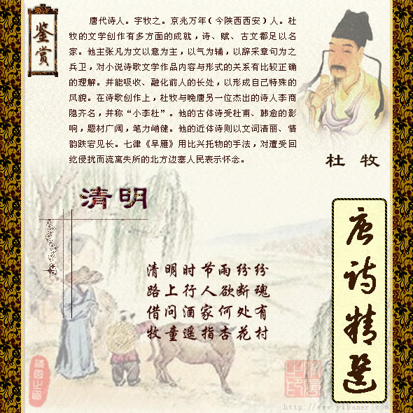 山西杏花村的白酒,醇香可口,年代长久。在杏花村考古工作者发掘出许多汉代的制酒的工具和酒器,推测大约在一千五百多年前的北魏时期就大规模地酿造白酒。到了唐代,村里酒店已经有七十二家了。杏花村的酒闻名于世,李白和杜甫也曾在此饮酒作诗,但杜牧的《清明》诗家喻户晓。据说,到了清朝,杏花村的酒家已经有了二百二十家。本诗大意是清明时节,本该家人团聚,可是对于冒雨赶路的行人来讲,不禁心情迷乱,难以平静,好在找到了解脱的形式。全诗自然流畅、通俗易懂、余味无穷。