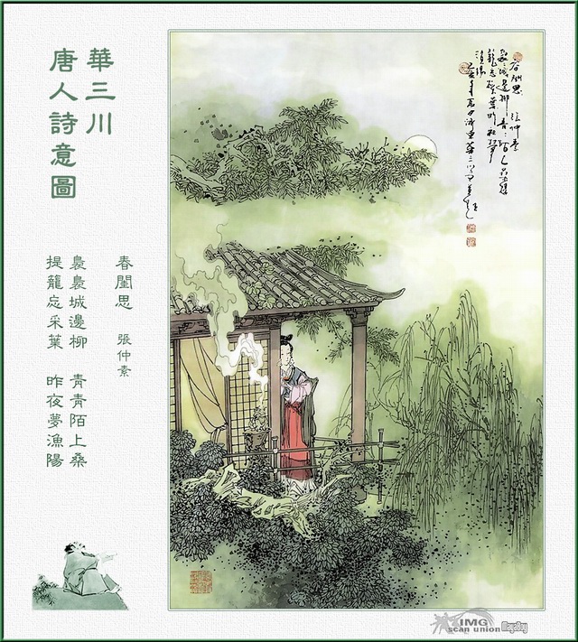 春闺思 张仲素 袅袅城边柳, 青青陌上桑。 提笼忘采叶, 昨夜梦渔阳。 ![]() 赏析: 风俗画画家画不出时间的延续,须选“包孕最丰富的片刻”画之,使人从一点窥见事件的前因后果。这一法门,对短小的文学样式似乎也合宜,比如某些短篇小说高手常用“不了了之”的办法,不到情事收场先行结束故事,任人寻味。而唐人五绝名篇也常有这种手法的运用,张仲素《春闺思》就是好例。 这诗的诗境很象画,甚而有几分象雕塑:一位采桑女子手提空笼(一种篮状竹器),斜倚在树旁,神情恍惚若有所忆……从这凝思的顷刻,借助作品标题(可命名为“梦渔阳”),观众会悟到很多画外之意。当然,诗毕竟是诗,终究有许多画图难足而只有文字可以传达的东西。 “袅袅城边柳,青青陌上桑”。城边、陌上、柳丝与桑林,已构成一幅春郊场景。“袅袅”写出柳条依人的意态,“青青”是柔桑逗人的颜色,这两个叠词又渲染出融和骀荡的无边春意。这就使读者如睹一幅村女采桑图:“蚕生春三月,春柳正含绿。女儿采春桑,歌吹当春曲”(《采桑度》),真可谓“无字处皆具义”(王夫之)。于是,这两句不仅是一般地写景,还给女主人公的怀思提供了典型环境:城边千万丝杨柳,会勾起送人的往事;而青青的柔桑,会使人联想到“昼夜常怀丝(思)”的春蚕,则思妇眼中之景无非难堪之离情了。 后二句在蚕事渐忙、众女采桑的背景上现出女主人公的特写形象:她倚树凝思,一动不动,手里提着个空“笼”——这是一个极富暗示性的“道具”,“提笼忘采叶”,表露出她身在桑下而心不在焉。心儿何往?末句就此点出“渔阳”二字,意味深长。“渔阳”是唐时征戍之地,当是这位闺中少妇所怀之人所在的地方。原来她是思念起从军的丈夫,伤心怨望。诗写到此已入正题,但它并未直说眼前少妇想夫之意,而是推到昨夜,说“昨夜梦渔阳”。写来不仅更婉曲,且能见昼夜怀思、无时或已之意,比单写眼前之思,情意更加深厚。 “提笼忘采叶”,这诗中精彩的一笔,许会使读者觉得似曾相识。杨慎早有见得,道是:“从《卷耳》首章翻出。”《诗经·卷耳》是写女子怀念征夫之诗,其首章云:“采采卷耳,不盈顷筐。嗟我怀人,置彼周行。”斜口小筐不难填满,卷耳也不难得,老采不满,是因心不在焉、老是“忘采叶”之故,其情景确与此诗有神似处。但就诗的整体说,彼此又很不同。《卷耳》接着就写了女子白日做梦,幻想丈夫上山、过冈、马疲、人病及饮酒自宽种种情景,把怀思写得非常具体。而此诗说到“梦渔阳”,似乎开了个头,接下去该写梦见什么,梦见怎样,但作者就此带住,不了了之。提笼少妇昨夜之梦境及她此刻的心情,一概留给读者,让其从人物的具体处境回味和推断,语约而意远。这就以最简的办法,获得很大的效果。因此,《春闺思》不是《卷耳》的摹拟,它已从古诗人手心“翻出”了。 (周啸天)