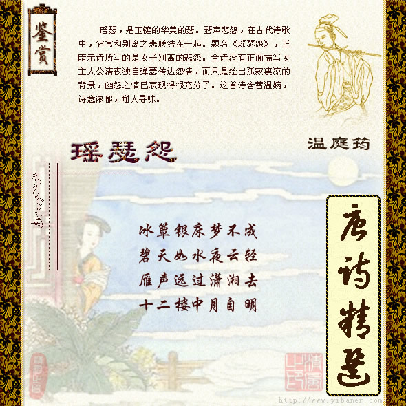 《瑶瑟怨》是唐代诗人温庭筠创作的一首七绝,是唐诗中脍炙人口的名篇之一。此诗描绘的是抒情主人公寂寞难眠而鼓瑟听瑟的各种感受,以表达别离之怨。全诗像是几种衔接紧密的写景镜头,表现了女主人公的心理活动和思想感情。冰簟、银床、碧空、明月、轻云、雁声、潇湘和月光笼罩下的玉楼,组成了一组离人幽怨的秋夜图,渲染了一种和主人公离怨情绪统一和谐的情调和氛围。虽没有正面描写女主人公清夜独自弹瑟传达怨情,而幽怨之情表现得很充分。作品含蓄温婉,诗意浓郁,耐人寻味。