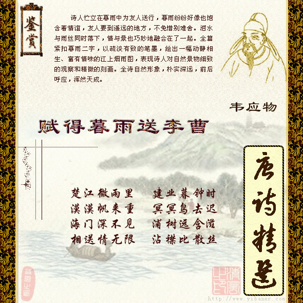 赋得暮雨送李曹① 韦应物 楚江②微雨里,建业③暮钟时。 漠漠④帆来重,冥冥⑤鸟去迟。 海门⑦深不见,浦⑧树远含滋⑾。 相送情无限,沾襟⑨比散丝⑩。 注释: ①赋得:分题赋诗,分到的什么题目,称为“赋得”。这里分得的题目是“暮雨”,故称“赋得暮雨”。 ②楚江:指长江。建业:今江苏南京。暮钟时:敲暮钟的时候。 ③建业:今江苏南京。 ④漠漠:水气迷茫的样子。 ⑤冥冥:天色昏暗的样子。 ⑦海门:长江入海处,在今江苏省海门市。 ⑧浦:近岸的水面。 ⑨沾襟:打湿衣襟。此处为双关语,兼指雨、泪。 ⑩散丝:指细雨,这里喻流泪。 ⑾含滋:湿润,带着水汽。 翻译: 长江上笼罩着霏霏细雨,建业城的暮钟声回荡天际。船帆沾湿后沉沉的变的显重了,慢慢行走,归鸟途中缓缓低飞。天边的海门隐没了影迹,江岸的远树湿润了芳枝。此时相送别情无限,泪已沾襟雨又如丝。 ![]() 这是一首雨中送别友人远行的诗,全诗紧扣暮雨,描写暮雨中的景象,手法妙绝,读后如见一幅薄暮烟雨送客图。近处船帆沾雨沉重,小鸟难飞。远处天色昏冥望不见海门,浦树含烟。描写景物,动静结合,近景与远景互相映衬。末联用一“比”字,将别泪和雨丝融成一体,离别之情与暮雨之景相比拟,恰到好处。作者分题赋诗,能够做到不流于斧凿,写景抒情皆是信手拈来,佳句天成,足见其大家风范. 这是一首送别诗。李曹,一作李胄,又作李渭,其人,其事,以及他与韦应物的关系,似已无考;从此诗看,想必两人的交谊颇深。诗中的“楚江”、“建业”,是送别之地。长江自三峡以下至濡须口(在今安徽省境内),古属楚地,所以叫楚江。建业,原名秣陵,三国时吴主孙权迁都于此,改称建业,旧城在今南京市南。 虽是送别,却重在写景,全诗紧扣“暮雨”和“送”字着墨。 首联“楚江微雨里,建业暮钟时”,起句点“雨”,次句点“暮”,直切诗题中的“暮雨”二字。“暮钟时”,即傍晚时分,当时佛寺中早晚都以钟鼓报时,所谓“暮鼓晨钟”。以楚江点“雨”,表明诗人正伫立江边,这就暗切了题中的“送”字。“微雨里”的“里”字,既显示了雨丝缠身之状,又描绘了一个细雨笼罩的压抑场面。这样,后面的帆重、鸟迟这类现象始可出现。这一联,淡淡几笔,便把诗人临江送别的形象勾勒了出来,同时,为二、三联画面的出现,涂上一层灰暗的底色。 下面诗人继续描摹江上景色:“漠漠帆来重,冥冥鸟去迟。海门深不见,浦树远含滋。” 细雨湿帆,帆湿而重;飞鸟入雨,振翅不速。虽是写景,但“迟”、“重”二字用意精深。下面的“深”和“远”又着意渲染了一种迷蒙暗淡的景色。四句诗,形成了一幅富有情意的画面。从景物状态看,有动,有静;动中有静,静中有动:帆来鸟去为动,但帆重犹不能进,鸟迟似不振翅,这又显出相对的静来;海门、浦树为静,但海门似有波涛奔流,浦树可见水雾缭绕,这又显出相对的动来。从画面设置看,帆行江上,鸟飞空中,显其广阔;海门深,浦树远,显其邃邈。整个画面富有立体感,而且无不笼罩在烟雨薄暮之中,无不染上离愁别绪。 景的设置,总是以情为转移的,所谓“情哀则景哀,情乐则景乐”(吴乔《围炉诗话》)。诗人总是选取对自己有独特感受的景物入诗。在这首诗里,那冥冥暮色,霏霏烟雨,固然是诗人着力渲染的,以求与自己沉重的心境相吻合,就是那些用来衬托暮雨的景物,也无不寄寓着诗人的匠心,挂牵着诗人的情思。海门是长江的入海处。南京临江不临海,离海门有遥遥之距,海门“不见”,自不待言,何故以此入诗?此处并非实指,而是暗示李曹的东去,就视觉范围而言,即指东边很远的江面,那里似有孤舟漂泊,所以诗人极目而视,神萦魂牵。然而人去帆远,暮色苍苍,目不能及;但见江岸之树,栖身于雨幕之中,不乏空寂之意。无疑这海门、浦树蕴含着诗人怅惘凄戚的感情。诗中不写离舟而写来帆,也自有一番用意。李白的名句“孤帆远影碧空尽”是以离帆入诗的,写出了行人远去的过程,表达了诗人恋恋不舍的感情。此诗只写来帆,则暗示离舟已从视线中消失,而诗人仍久留不归,同时又以来帆的形象来衬托去帆的形象,而对来帆的关注,也就是对去帆的遥念。其间的离情别绪似更含蓄深沉。而那羽湿行迟的去鸟,不也是远去行人的写照吗? 经过铺写渲染烟雨、暮色、重帆、迟鸟、海门、浦树,连同诗人的情怀,交织起来,形成了浓重的阴沉压抑的氛围。置身其间的诗人,情动于衷,不能自已。猛然,那令人肠断的钟声传入耳鼓,撞击心弦。此时,诗人再也抑止不住自己的感情,不禁潸然泪下,离愁别绪喷涌而出:“相送情无限,沾襟比散丝。”随着情感的迸发,尾联一改含蓄之风,直抒胸臆;又在结句用一个“比”字,把别泪和散丝交融在一起。“散丝”,即雨丝,晋张协《杂诗》有“密雨如散丝”句。这一结,使得情和景“妙合无垠”,“互藏其宅”(王夫之《姜斋诗话》),既增强了情的形象性,又进一步加深了景的感情然彩。从结构上说,以“微雨”起,用“散丝”结,前后呼应;全诗四联,一脉贯通,浑然一体。