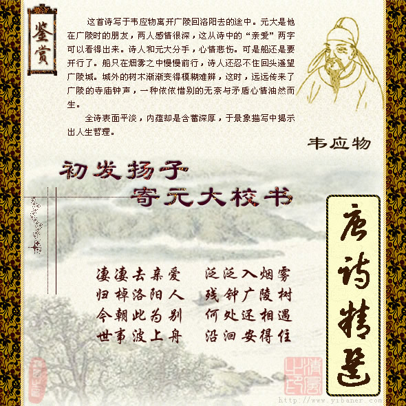 作者:韦应物 凄凄去亲爱,泛泛入烟雾。 归棹洛阳人,残钟广陵树。 今朝为此别,何处还相遇。 世事波上舟,沿洄安得住。 ![]() 注释 ⑴扬子:指扬子津,在长江北岸,近瓜州。校书:官名。唐代的校书郎,掌管校书籍。 ⑵去:离开。亲爱:相亲相爱的朋友,指元大。 ⑶泛泛:行船漂浮。 ⑷归棹:指从扬子津出发乘船北归洛阳。 ⑸“残钟”句:意渭回望广陵,只听得晓钟的残音传自林间。广陵:江苏扬州的古称。在唐代,由扬州经运河可以直达洛阳。 ⑹此:此处。为别:作别。 ⑺还:再。 ⑻沿洄:顺流而下为沿,逆流而上为洄,这里指处境的顺逆。安得住:怎能停得住? 作品译文 凄怆地离别了亲爱的朋友,船只泛泛地驶入茫茫烟雾。 轻快地摇桨向着洛阳归去,晓钟残音还远绕广陵树木。 今日在此我与你依依作别,何时何地我们能再次相遇? 人情世事犹如波上的小船,顺流洄旋岂能由自己作主? 这首诗写于韦应物离开广陵(今江苏扬州)回洛阳去的途中。韦应物曾客游广陵,元大(大是排行,其人名字已不可考)是他在广陵的朋友,诗中用“亲爱”相称,可见彼此感情颇深。公元763年(代宗广德元年),韦氏被任命为洛阳丞,在乘船离开广陵赴任洛阳的时候,对元大校书非常怀念,于是写了这首诗寄给他。 《初发扬子寄元大校书》是唐代诗人韦应物的作品。此诗由送友启程到舟行江上,联想到世事的难测,写得很有情致,也吐露了诗人被罢官以后的心情。开头两句写别离之“初发”。三、四句写友人乘舟归去。五、六句写期望重逢。最后两句以舟行不定,喻世事之顺逆翻复,难以自主。全诗借景抒情,寓情于景,表面看似平淡,内蕴却是含蓄深厚,于景象描写中揭示出人生哲理。