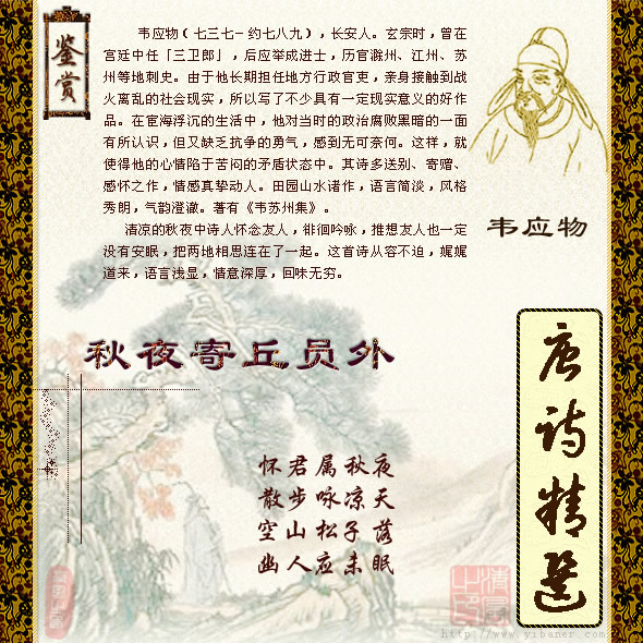 秋夜寄邱员外 韦应物 怀君属秋夜,散步咏凉天。 空山松子落,幽人应未眠。 ![]() 注释 ⑴邱二十二员外:名丹,苏州人,曾拜尚书郎,后隐居平山上。一作“邱二十二员外”。 ⑵属:正值,适逢,恰好。 ⑶幽人:幽居隐逸的人,悠闲的人,此处指邱员外。 作品译文 怀念你竟在这深秋的夜晚,散步咏叹多么寒凉的霜天。 想此刻空山中正掉落松子,幽居的友人一定还未安眠。 韦应物的五言绝句,一向为诗论家所推崇。胡应麟在《诗薮》中说:“中唐五言绝,苏州最古,可继王、孟。”沈德潜在《说诗晬语》中说:“五言绝句,右丞之自然、太白之高妙、苏州之古淡,并入化境。”上面这首诗是他的五绝代表作之一。它给予读者的艺术享受,首先就是这一古雅闲淡的风格美。施补华在《岘佣说诗》中曾称赞这首诗“清幽不减摩诘,皆五绝中之正法眼藏也”。它不以强烈的语言打动读者,只是从容下笔,淡淡着墨,而语浅情深,言简意长,使人感到韵味悠永,玩绎不尽。 如果就构思和写法而言,这首诗还另有其值得拈出之处。它是一首怀人诗。前半部分写诗人自己,即怀念友人之人;后半部分写正在临平山学道的丘丹,即诗人所怀念之人。首句“怀君属秋夜”,点明季节是秋天,时间是夜晚,而这“秋夜”之景与“怀君”之情,正是彼此衬映的。次句“散步咏凉天”,承接自然,全不着力,而紧扣上句。“散步”是与“怀君”相照应的:“凉天”是与“秋夜”相绾合的。这两句都是写实,写出了作者因怀人而在凉秋之夜徘徊沉吟的情景。接下来,作者不顺情抒写,就景描述,而把诗思飞驰到了远方,在三、四两句中,想象所怀念之人在此时、彼地的状况。而这三、四两句又是紧扣一、二两句的。第三句“山空松子落”,遥承“秋夜”、“凉天”,是从眼前的凉秋之夜,推想临平山中今夜的秋色。第四句“幽人应未眠”,则遥承“怀君”、“散步”,是从自己正在怀念远人、徘徊不寐,推想对方应也未眠。这两句出于想象,既是从前两句生发,而又是前两句诗情的深化。从整首诗看,作者运用写实与虚构相结合的手法,使眼前景与意中景同时并列,使怀人之人与所怀之人两地相连,进而表达了异地相思的深情。 陆机在《文赋》中指出,作者在构思时,可以“观古今于须臾,抚四海于一瞬”。刘勰在《文心雕龙·神思篇》中也说:“文之思也,其神远矣。故寂然凝虑,思接千载;悄焉动容,视通万里。”这些话说明文思是最活跃的,是不受时空限制的。因此,在诗人笔下,同一空间里,可以呈现不同的时间;同一时间里,也可以呈现不同的空间。像王播的《题木兰院》:“三十年前此院游,木兰花发院新修;如今再到经行处,树老无花僧白头”,就属于前者。而这首韦应物的怀人诗,则属于后者。现代的电影艺术,有时采用叠影手法来处理回忆与遥想的镜头,有时使银幕上映出两上或两个以上的画面,使观众同时看到在两个或两个以上的空间或时间里出现的不同场景。这首诗运用的手法正与此相同。它使读者在一首诗中看到两个空间,既看到怀人之人,也看到被怀之人,既看到作者身边之景,也看到作者遥想之景,从而把异地相隔的人和景并列和相连在一起,说明千里神交,有如晤对,故人虽远在天涯,而想思却近在咫尺。