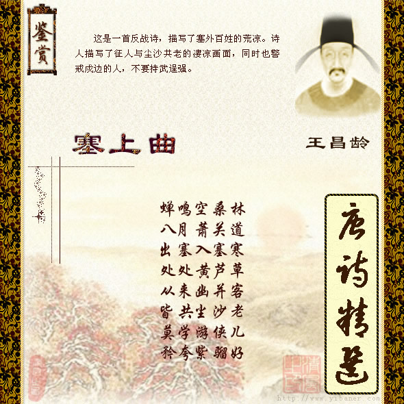 蝉鸣空桑林,八月萧关道。 出塞复入塞,处处黄芦草。 从来幽并客,皆向沙场老。 莫学游侠儿,矜夸紫骝好。 ![]() 【注解】: 1、幽、并:幽州和并州,今河北、山西和陕西一部分。 2、游侠儿:指恃武勇、逞意气而轻视性命的人。 3、矜:自鸣不凡。 【韵译】: 知了在枯秃的桑林鸣叫,八月的萧关道气爽秋高。 出塞后再入塞气候变冷,关内关外尽是黄黄芦草。 自古来河北山西的豪杰,都与尘土黄沙伴随到老。 莫学那自恃勇武游侠儿,自鸣不凡地把骏马夸耀。 【评析】: 这首乐府歌曲是写非战的。诗由征戍边塞庶几不回,而告诫少年莫夸武力,抒发非战之情。写边塞秋景,无限萧煞悲凉,写戍边征人,寄寓深切同情;劝世上少年、声声实在,句句真情。“从来幽并客,皆共尘沙老”,与王翰的“醉卧沙场君莫笑,古来征战几人回”,可谓英雄所见,异曲同工,感人至深。