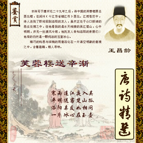 作者:王昌龄 寒雨连江夜入吴,平明送客楚山孤。 洛阳亲友如相问,一片冰心在玉壶。 ![]() 【注解】: 1、芙蓉楼:原址在今江苏省镇江市西北。 2、楚山:古时吴、楚两地相接,镇江一带也称楚地,故其附近的山也可叫楚山。 【韵译】: 迷蒙的烟雨,连夜洒遍吴地江天; 清晨送走你,孤对楚山离愁无限! 朋友呵,洛阳亲友若是问起我来; 就说我依然冰心玉壶,坚守信念! 【评析】: 这是一首送别诗。诗的构思新颖,淡写朋友的离情别绪,重写自己的高风亮节。 首两句苍茫的江雨和孤峙的楚山,烘托送别时的孤寂之情;后两句自比冰壶,表达自己开郎胸怀和坚强性格。全诗即景生情,寓情于景,含蓄蕴藉,韵味无穷。