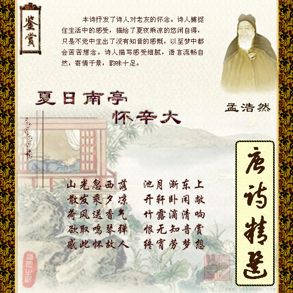 作者:孟浩然 山光忽西落,池月渐东上。 散发乘夕凉,开轩卧闲敞。 荷风送香气,竹露滴清响。 欲取鸣琴弹,恨无知音赏。 感此怀故人,中宵劳梦想。 ![]() 【注解】: 1、山光:山上的日光。 2、池月:即池边月色。 3、轩:窗。 【韵译】: 夕阳忽然间落下了西山,东边池角明月渐渐东上。 披散头发今夕恰好乘凉,开窗闲卧多么清静舒畅。 清风徐徐送来荷花幽香,竹叶轻轻滴下露珠清响。 心想取来鸣琴轻弹一曲,只恨眼前没有知音欣赏。 感此良宵不免怀念故友,只能在夜半里梦想一场。 【评析】: 此诗写夏夜水亭纳凉清爽闲适和对友人的怀念。 诗的开头写夕阳西下与素月东升,为纳凉设景。三、四句写沐后纳凉,表现闲情适意。五、六句由嗅觉继续写纳凉的真实感受。七、八句写由境界清幽想到弹琴,想到“知音”、从纳凉过渡到怀人。最后写希望友人能在身边共度良宵而生梦。 全诗感情细腻,语言流畅,层次分明,富于韵味。“荷风送香气,竹露滴清响” 句,纳凉消暑之佳句。