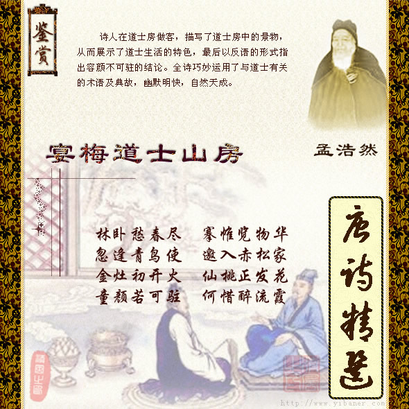 作者:孟浩然 林卧愁春尽,搴帷见物华。 忽逢青鸟使,邀入赤松家。 金灶初开火,仙桃正发花。 童颜若可驻,何惜醉流霞。 ![]() 【注解】: 1、青鸟:神话中鸟名,西王母使者。这里指梅道士。 2、赤松:赤松子,传说中的仙人。这里也指梅道士。 3、金灶:道家炼丹的炉灶。 4、仙桃:传说西王母曾以仙桃赠汉武帝,称此桃三千年才结实。 5、童颜两句:意谓如果仙酒真能使容颜不老,那就不惜一醉。流霞:仙酒名。李商隐《武夷山诗》:“只得流霞酒一杯。”这里也指醉颜。 【韵译】: 高卧林下正愁着春光将尽,掀开帘幕观赏景物的光华。 忽然遇见传递信件的使者,原是赤松子邀我访问他家。 炼丹的金炉灶刚刚生起火,院苑中的仙桃也正好开花。 如果仙人真可以保住童颜,何惜醉饮返老还童的流霞。 【评析】: 诗以隐士身分而宴于梅道士山房,因而借用了金灶、仙桃、驻颜、流霞等术语和运用青鸟、赤松子等典故,描述了道士山房的景物,赋予游仙韵味,流露了向道之意。