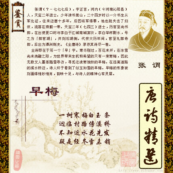 张谓 一树寒梅白玉条,迥临村路傍溪桥。 不知近水花先发,疑是经冬雪未销。 ![]() 注释 ⑴迥:远。 ⑵傍:靠近。 ⑶发:开放。 ⑷销:通“消”,融化。 译文 有一树梅花凌寒早开,枝条洁白如玉。 它远离人来车往的村路,临近溪水桥边。 人们不知寒梅靠近溪水提早开放, 以为那是经冬而未消融的白雪。 赏析 自古诗人以梅花入诗者不乏佳篇,有人咏梅的风姿,有人颂梅的神韵;这首咏梅诗,则侧重写一个“早”字。 首句既形容了寒梅的洁白如玉,又照应了“寒”字。写出了早梅凌寒独开的丰姿。第二句写这一树梅花远离人来车往的村路,临近溪水桥边。一个“迥”字,一个“傍”字,写出了“一树寒梅”独开的环境。这一句承上启下,是全诗发展必要的过渡,“溪桥”二字引出下句。第三句,说一树寒梅早发的原因是由于“近水”;第四句回应首句,是诗人把寒梅疑做是经冬而未消的白雪。一个“不知”加上一个“疑是”,写出诗人远望似雪非雪的迷离恍惚之境。最后定睛望去,才发现原来这是一树近水先发的寒梅,诗人的疑惑排除了,早梅之“早”也点出了。 梅与雪常常在诗人笔下结成不解之缘,如许浑《早梅》诗云:“素艳雪凝树”,这是形容梅花似雪,而张谓的诗句则是疑梅为雪,着意点是不同的。对寒梅花发,形色的似玉如雪,不少诗人也都产生过类似的疑真的错觉。宋代王安石有诗云:“遥知不是雪,为有暗香来”,也是先疑为雪,只因暗香袭来,才知是梅而非雪,和此篇意境可谓异曲同工。而张谓此诗,从似玉非雪、近水先发的梅花着笔,写出了早梅的形神,同时也写出了诗人探索寻觅的认识过程。并且透过表面,写出了诗人与寒梅在精神上的契合。读者透过转折交错、首尾照应的笔法,自可领略到诗中悠然的韵味和不尽的意蕴。