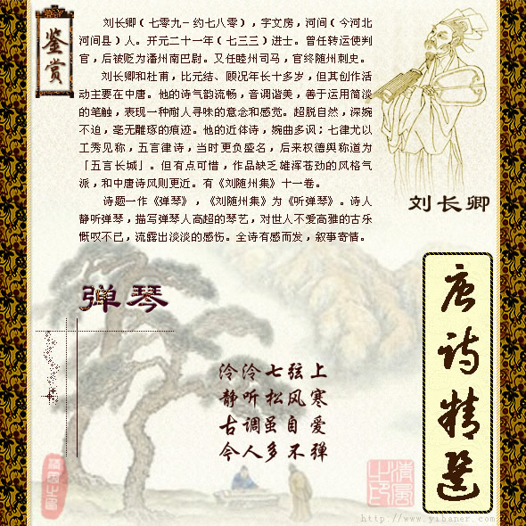 作者:刘长卿 泠泠七弦上,静听松风寒。 古调虽自爱,今人多不弹。 ![]() 【注解】: 1、泠泠:洋溢貌。 2、七弦:古琴有七条弦,故称七弦琴。 3、松风寒:松风,琴曲名,指《风入松》曲。寒:凄清的意思。 【韵译】: 凄清的音乐发自七弦古琴,静静细听是风入松的古音。 我就爱这令人神往的古曲,只可惜如今世上不太流行。 【评析】: 这是一首借咏古调的冷落,不为人所重视,来抒发怀才不遇,世少知音的小诗。 前两句描摹音乐境界,后两句抒发情怀。全诗从对琴声的赞美,转而对时尚慨叹,流露了诗人孤高自赏,不同凡俗,稀有知音的情操。