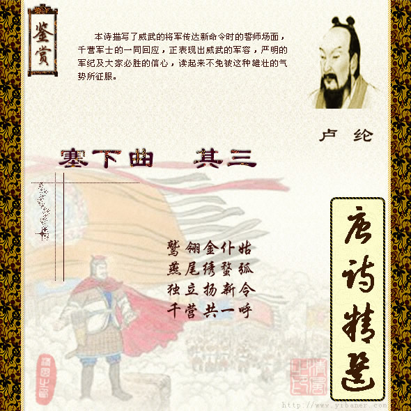 作者:卢纶 鹫翎金仆姑,燕尾绣蝥弧。 独立扬新令,千营共一呼。 ![]() 【注解】: 1、鹫:大鹰; 2、翎:羽毛; 3、金仆姑:箭名。 4、燕尾:旗上的飘带; 5、蝥弧:旗名。 【韵译】: 身佩雕羽制成的金仆姑好箭,旌旗上扎成燕尾蝥弧多鲜艳。 大将军威严地屹立发号施令,千军万马一呼百应动地惊天。 【评析】: 这组诗,原共六首,蘅塘退士选其四首。诗是歌咏边塞景物。第一首写将军动员出发时的声势。