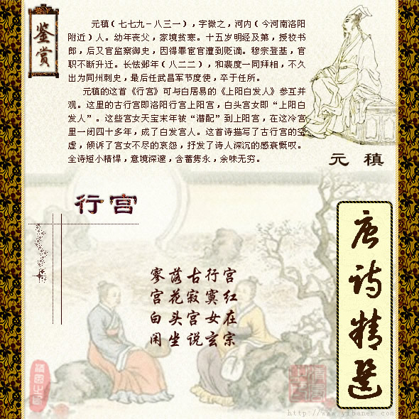 作者:元稹 寥落古行宫,宫花寂寞红。 白头宫女在,闲坐说玄宗。 ![]() 【注解】: 1、寥落:寂寞冷落。 2、行宫:皇帝在京城之外的宫殿。 【韵译】: 早已空虚冷寞的古行宫,零落宫花依然开行艳红。 有几个满头白发的宫女,闲坐谈论当年的唐玄宗。 【评析】: 这是一首抒发盛衰之感的诗。首句点明地点:古行宫;二句暗示时间:红花盛开之季;三句介绍人物;白头宫女;四句描绘动作:闲坐说玄宗。构筑了一幅完整动人的图画。当年花容月貌,娇姿艳质,辗转落入宫中,寂寞幽怨;如今青春消逝,红颜憔悴;闲坐无聊,只有谈论已往。此情此景,好不凄绝!