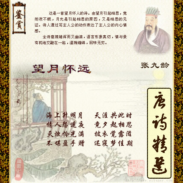 作者:张九龄 海上生明月,天涯共此时。 情人怨遥夜,竟夕起相思。 灭烛怜光满,披衣觉露滋。 不堪盈手赠,还寝梦佳期。 ![]() 【注解】: 1、灭烛两句:刻划相思时心神恍惚,不觉从室内走到室外。爱月灭烛,露凉披衣,写尽无眠。 【韵译】: 一轮皎洁的明月,从海上徐徐升起; 和我一同仰望的,有远在天涯的伊。 有情人天各一方,同怨长夜之难挨; 孤身彻夜不成眠,辗转反侧起相思。 灭烛欣赏明月呵,清光淡淡泻满地; 起身披衣去闲散,忽觉露珠侵人肌。 月光虽美难采撷,送它给远方亲人; 不如还家睡觉,或可梦见相会佳期。 【评析】: 此诗乃望月怀思的名篇,写景抒情并举,情景交融。诗人望见明月,立刻想到远在天边的亲人,此时此刻正与我同望。有怀远之情的人,难免终夜相思,彻夜不眠。 身居室内,灭烛望月,清光满屋,更觉可爱;披衣出户,露水沾润,月华如练,益加陶醉。如此境地,忽然想到月光虽美却不能采撷以赠远方亲人,倒不如回到室内,寻个美梦,或可期得欢娱的约会。 诗的意境幽静秀丽,情感真挚。层层深入不紊,语言明快铿锵,细细品味,如尝橄榄,余甘无尽。“海上生明月,天涯共此时”为千古佳句,意境雄浑豁达。