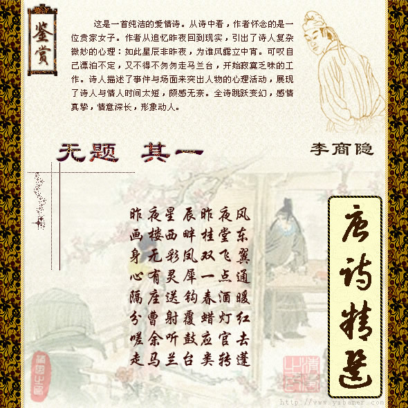 作者:李商隐 昨夜星辰昨夜风,画楼西畔桂堂东。 身无彩凤双飞翼,心有灵犀一点通。 隔座送钩春酒暖,分曹射覆蜡灯红。 嗟余听鼓应官去,走马兰台类转蓬。 ![]() 【注解】: 1、画楼、桂堂:都是比喻富贵人家的屋舍。 2、灵犀:旧说犀牛有神异,角中有白纹如线,直通两头。 3、送钩:也称藏钩。古代腊日的一种游戏,分二曹以较胜负。把钩互相传送后,藏于一人手中,令人猜。 4、分曹:分组。 5、射覆:在覆器下放着东西令人猜。分曹、射覆未必是实指,只是借喻宴会时的热闹。 6、鼓:指更鼓。 7、应官:犹上班。 8、兰台:即秘书省,掌管图书秘籍。李商隐曾任秘书省正字。这句从字面看,是参加宴会后,随即骑马到兰台,类似蓬草之飞转,实则也隐含自伤飘零意。 【韵译】: 昨夜星光灿烂,夜半却有习习凉风; 我们酒筵设在画楼西畔、桂堂之东。 身上无彩凤的双翼,不能比翼齐飞; 内心却象灵犀一样,感情息息相通。 互相猜钩嬉戏,隔座对饮春酒暖心; 分组来行酒令,决一胜负烛光泛红。 可叹呵,听到五更鼓应该上朝点卯; 策马赶到兰台,象随风飘转的蓬蒿。 【评析】: 所谓“无题”诗,历来有不同看法:有人认为应属于寓言,有人认为都是赋本事的。就李商隐的“无题”诗来看,似乎都是属于写艳情的,实有所指,只是不便说出而巳。 此诗是追忆所遇见的艳情场景。先写筵会时地;接着写形体相隔,人情相通;再写相遇的情意绵绵;最后写别后离恨。艳丽而不猥亵,情真而不痴癫。