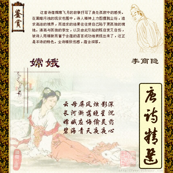 作者:李商隐 云母屏风烛影深,长河渐落晓星沉。 嫦娥应悔偷灵药,碧海青天夜夜心。 ![]() 【注解】: 1、深:暗。 2、长河:银河。 3、碧海青天:指嫦娥的枯燥生活,只能见到碧色的海,深蓝色的天。 4、夜夜心:指嫦娥每晚都会感到孤单。 【韵译】: 云母屏风染上一层浓浓的烛影,银河逐渐斜落启明星也已下沉。 嫦娥想必悔恨当初偷吃不死药,如今独处碧海青天而夜夜寒心。 【评析】: 就内容而论,这是一首咏嫦娥的诗。然而各家看法不一。有人以为歌咏意中人的私奔,有人以为是直接歌咏主人公处境孤寂,有人以为是借咏嫦娥另外有所寄托,有人以为是歌咏女子学道求仙,有人以为应当作“无题”来看。我们姑且当作歌咏幽居寂处,终夜不眠的女子。以此而论,着实写得贴情贴理。语言含蕴,情调感伤。